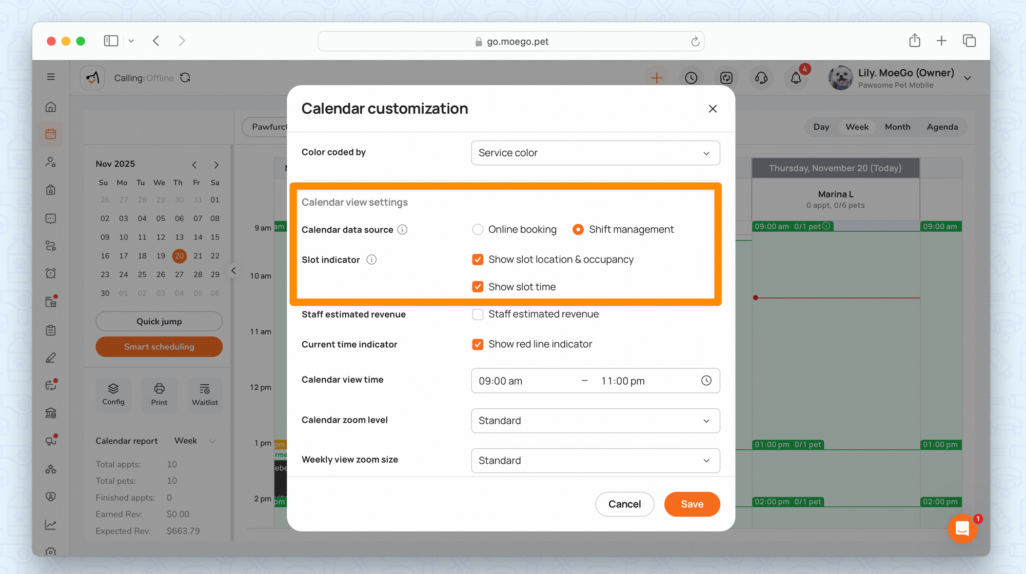 - Slot occupancy (e.g., "3/5 pets booked")
