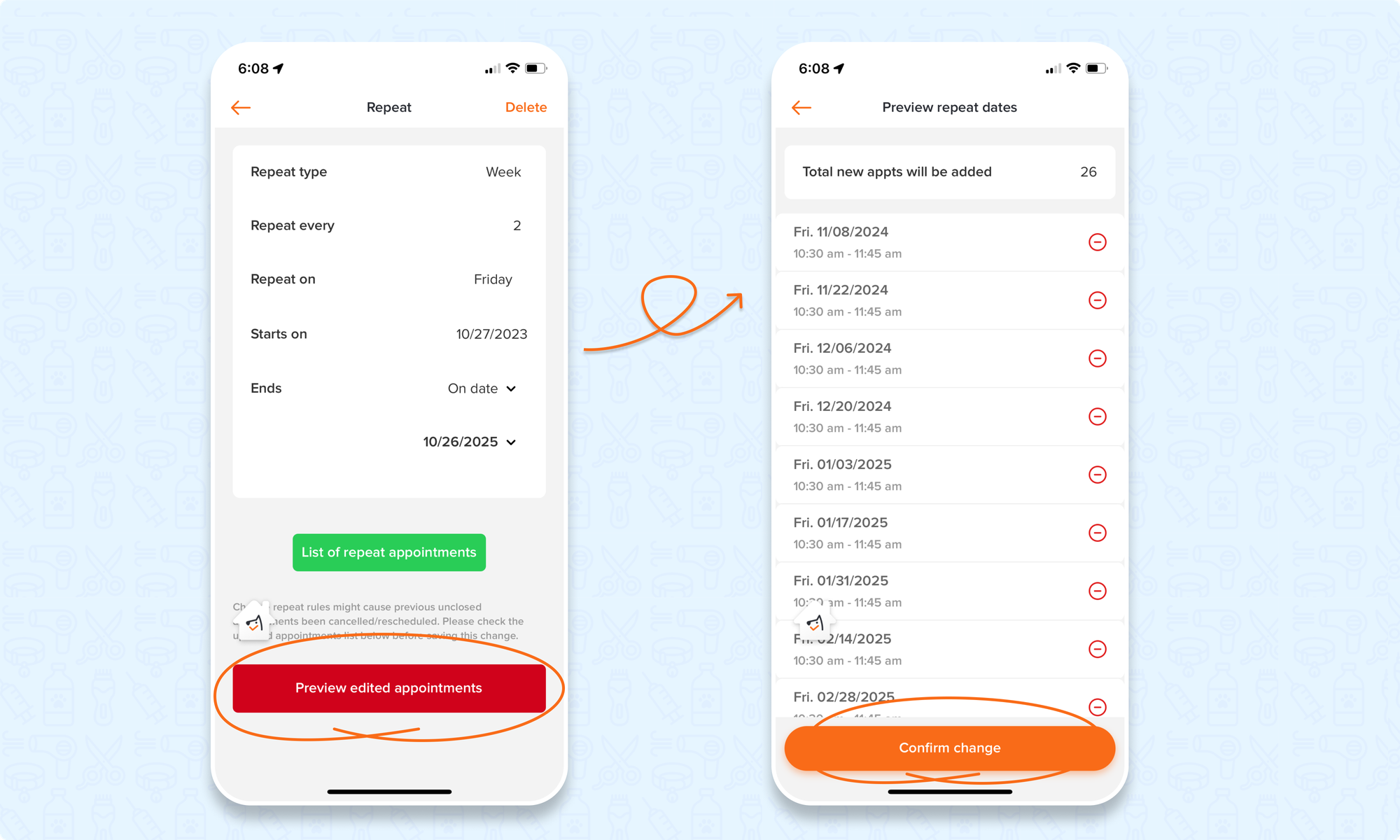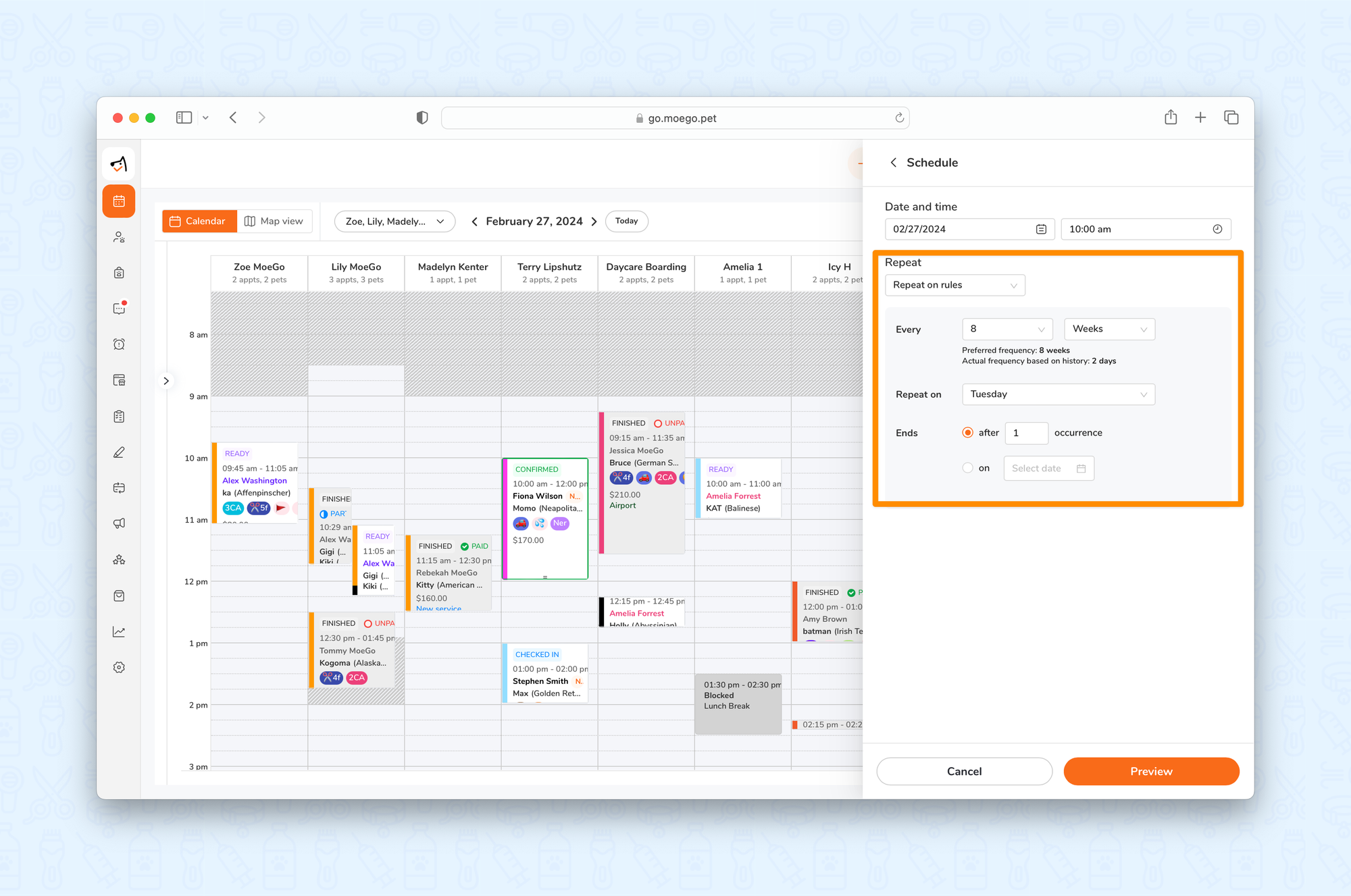 - Repeat on Rules: Enjoy dynamic and personalized recommendations aligned with your client's grooming preferences and visit history. Customize appointment frequency, days, and duration effortlessly for seamless scheduling.