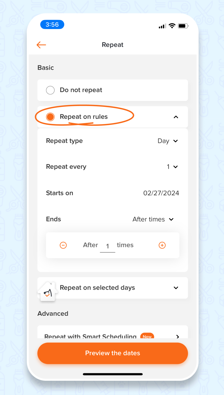 - Select < Repeat on rules >, < Repeat on selected days >, or < Repeat with Smart Scheduling >