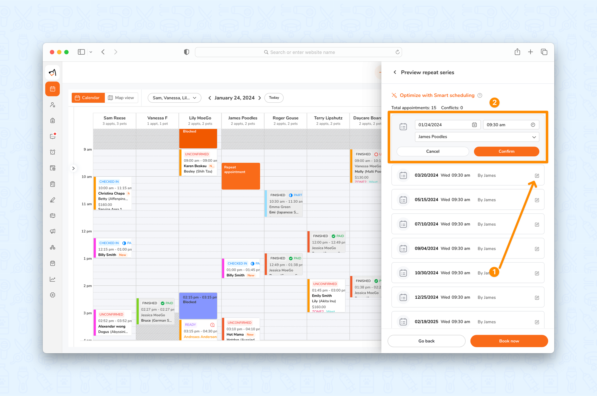 Streamline your scheduling process for loyal clients by setting up repeat appointments with ease. In just a few clicks, you can create a series of recurring appointments, saving valuable time and eliminating the need to manually schedule each individual appointment.