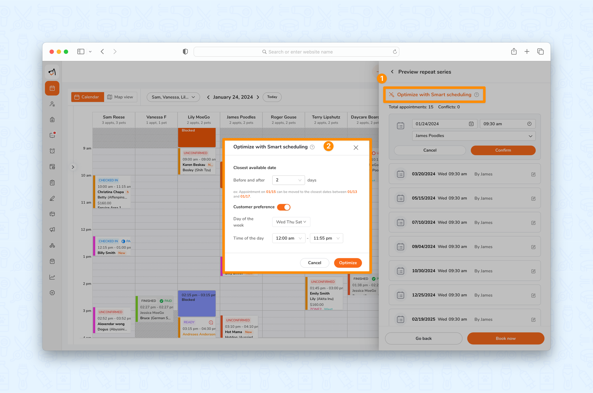 - Clicking on < Optimize with Smart Scheduling >: This feature, powered by Smart Scheduling, attempts to resolve conflicts by considering existing appointments, blocks, and working hours. It optimizes client time preferences and your custom driving rules, such as drive time, distance, start/end location, and service areas for certain days.