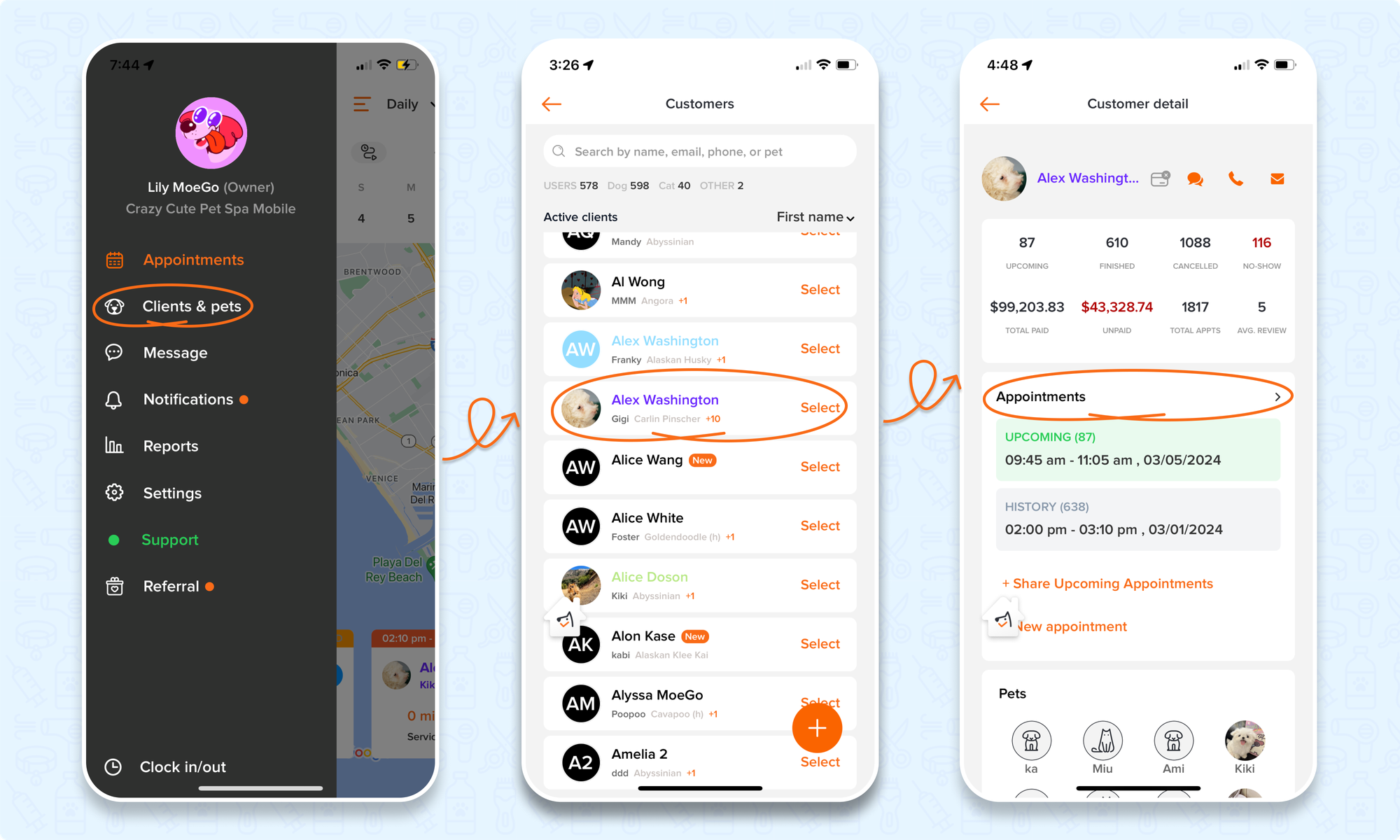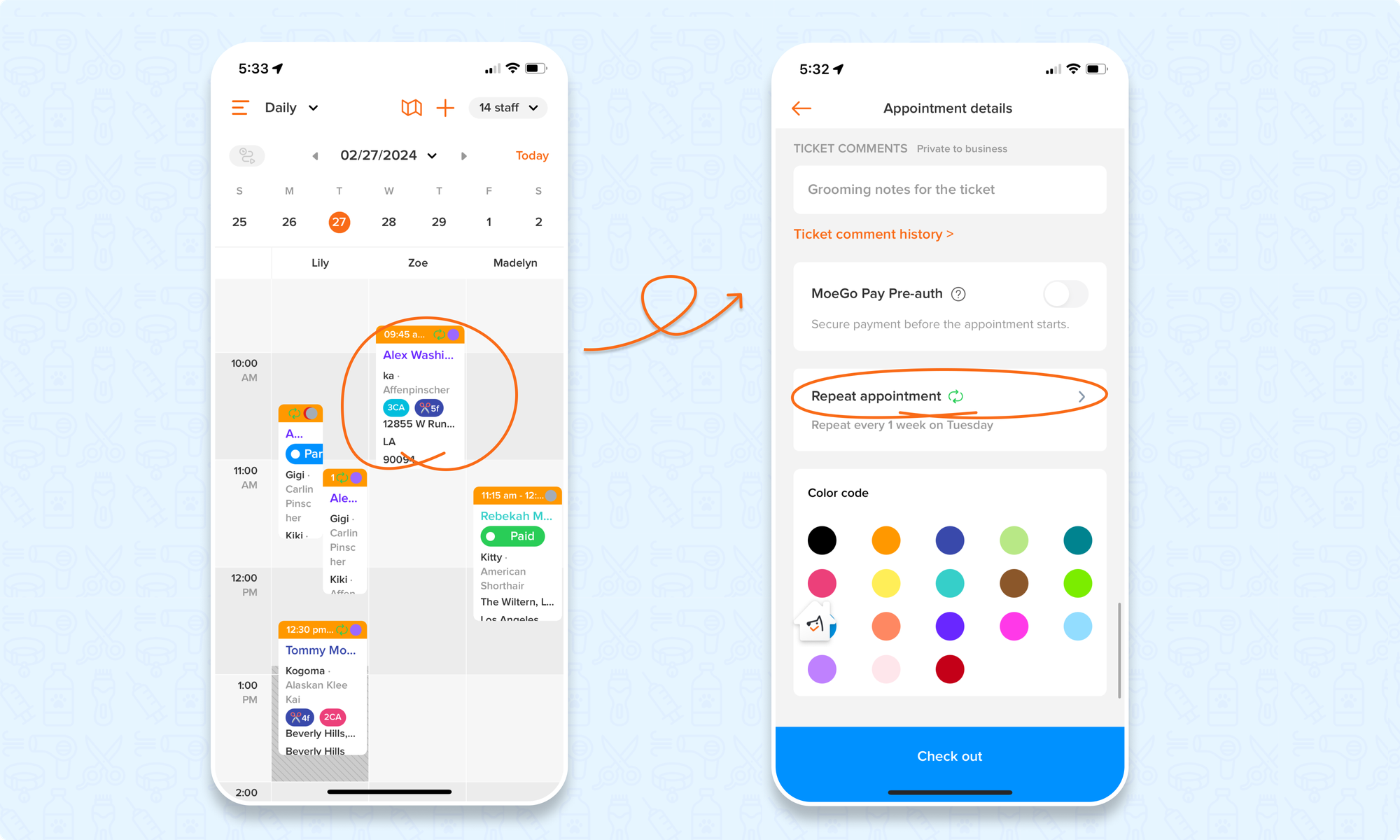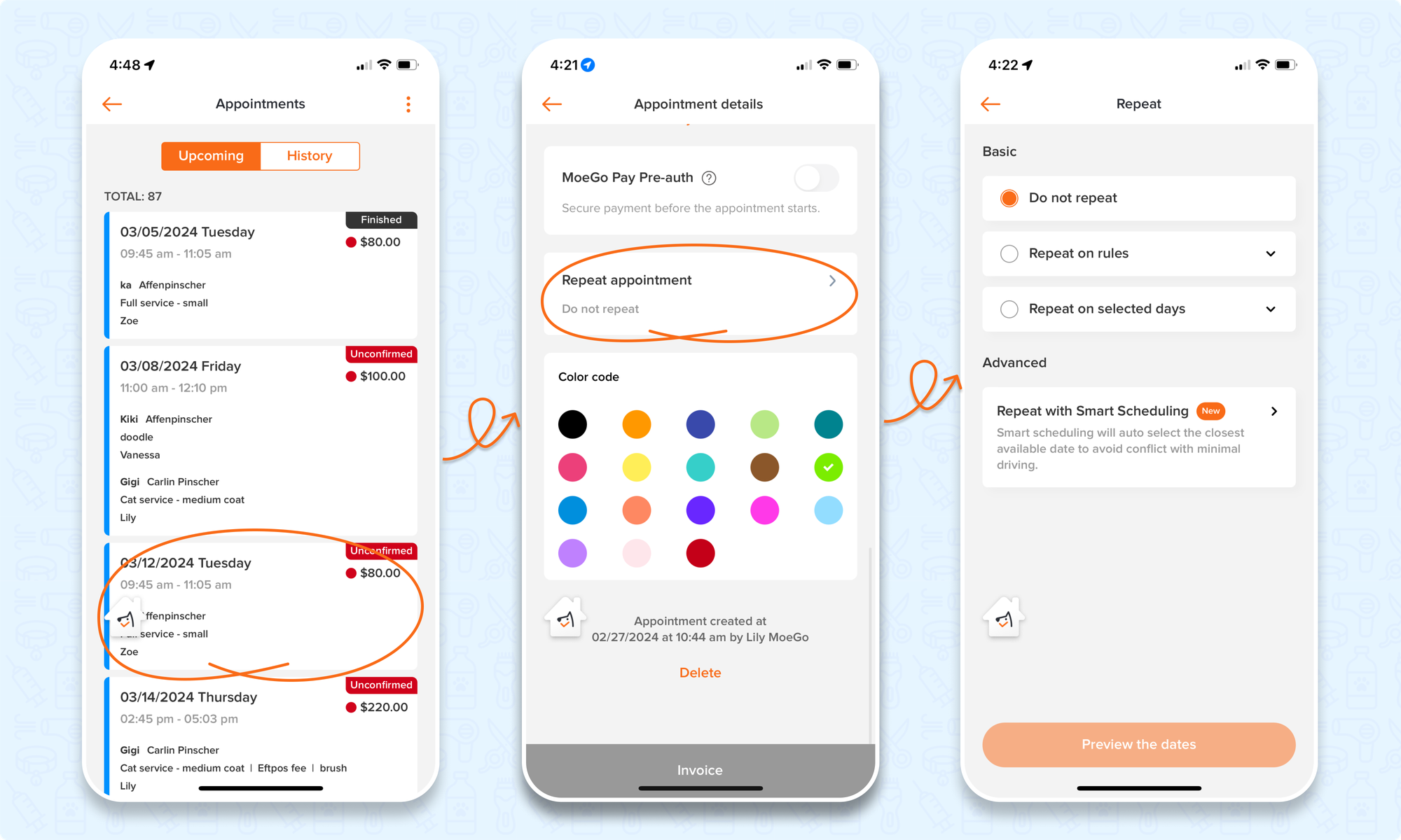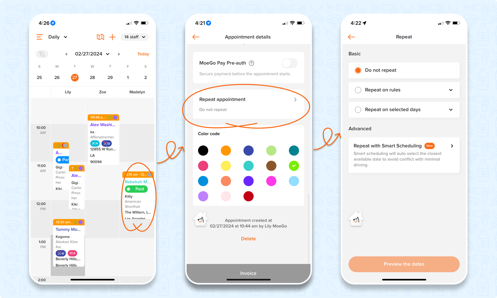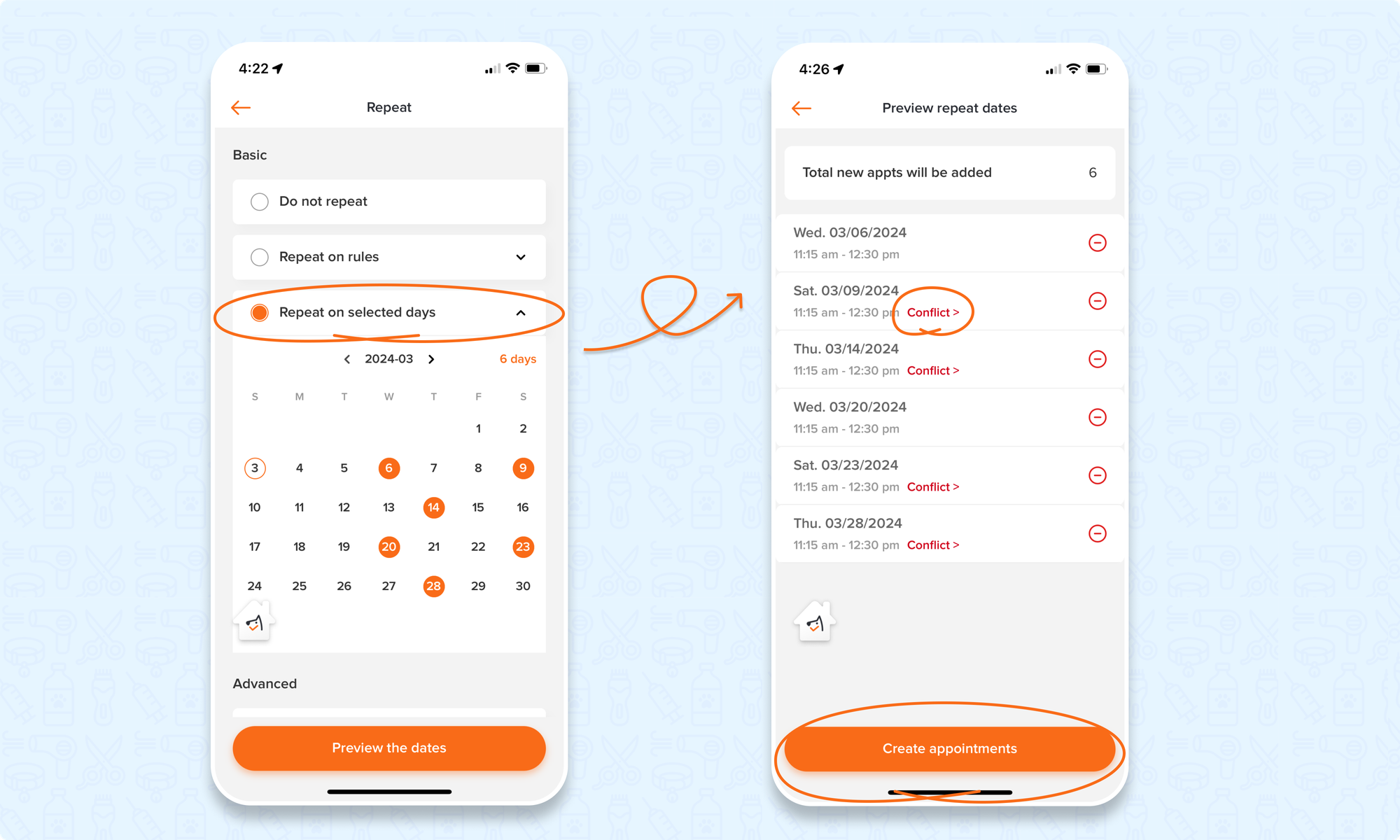 - Repeat on Selected Days: Effortlessly schedule recurring appointments on designated days, allowing for personalized and convenient grooming sessions tailored to your clients' schedules.