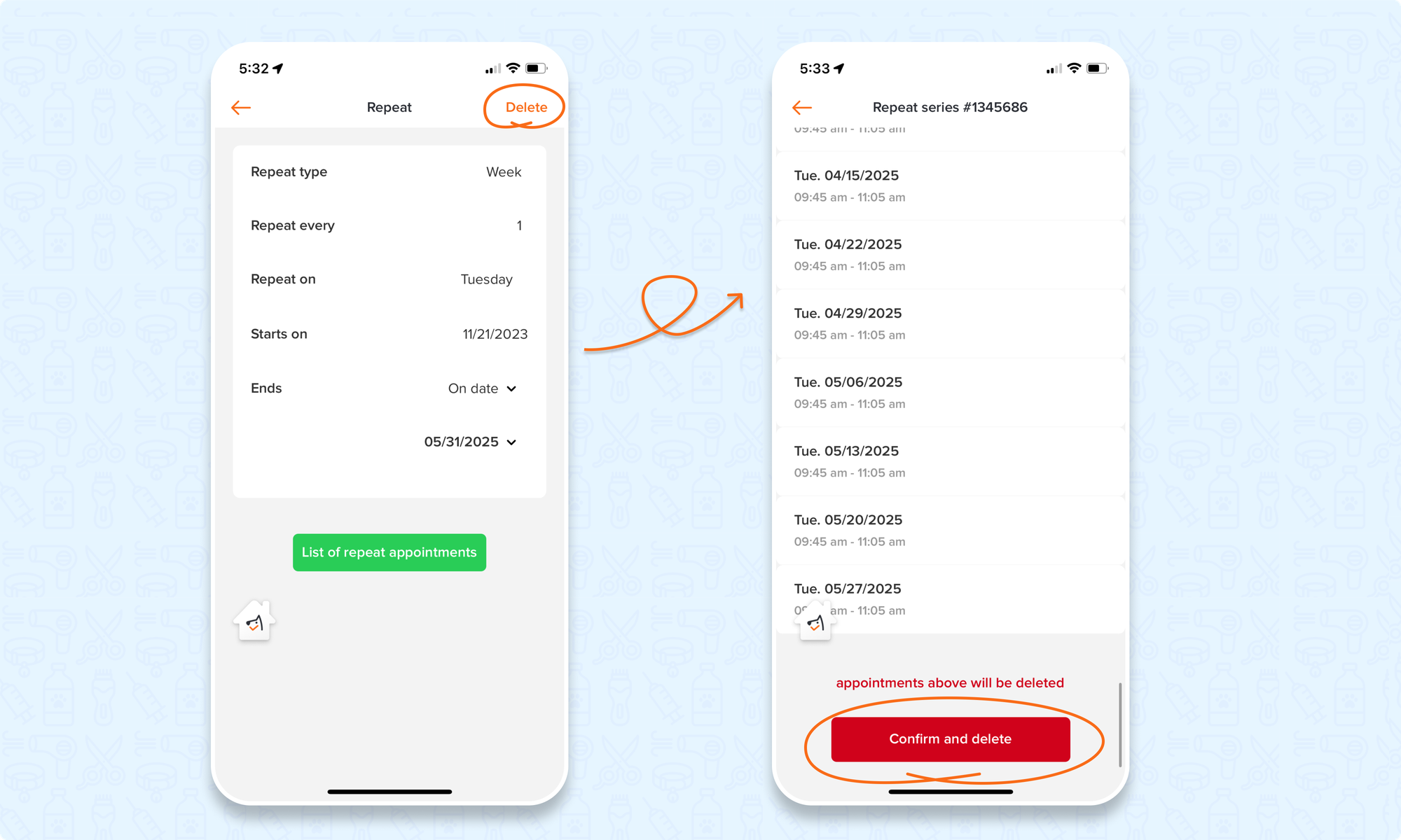 You have the option to delete future appointments within a specific repeat series. This action won't impact your appointments that are already in the finished status. You'll be presented with a list of appointment dates to confirm and proceed with deletion.