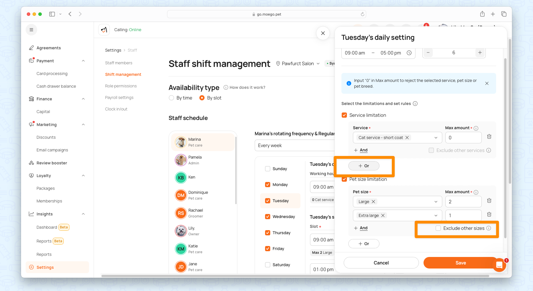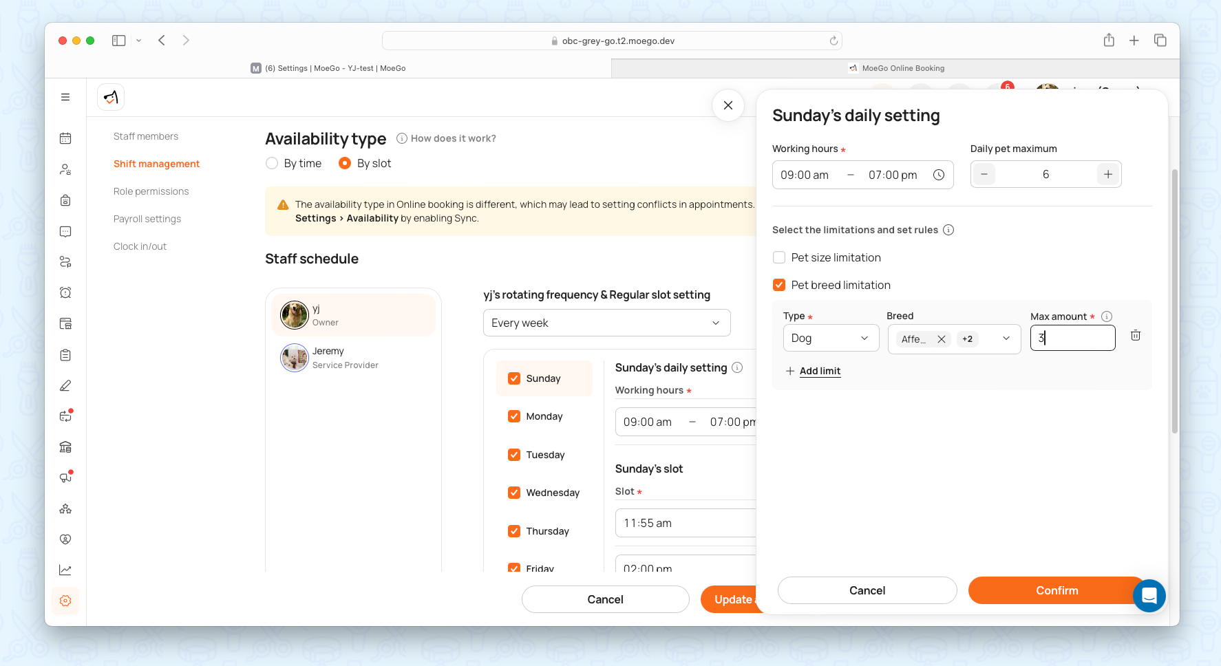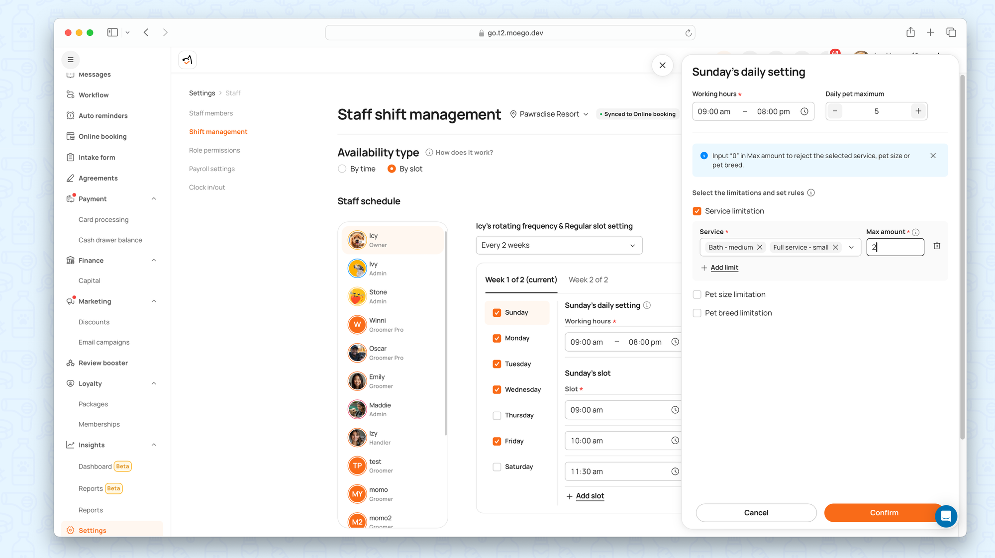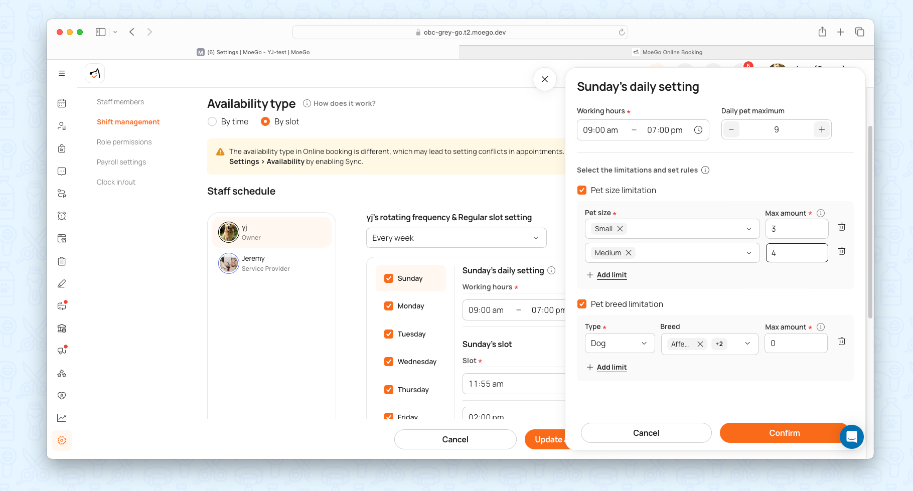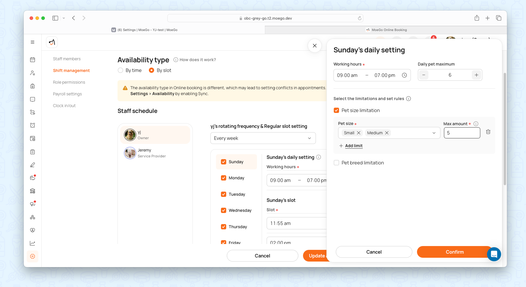 These rules apply to services, pet sizes, and pet types, giving businesses unmatched flexibility in managing availability.