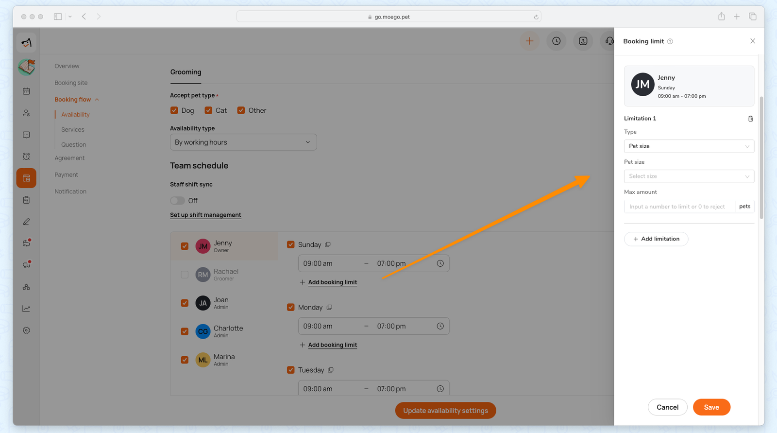 Booking Limits allow businesses to set maximum appointment slots for pet sizes or breeds. This ensures balanced workloads, prevents overbooking, and helps maintain service quality.