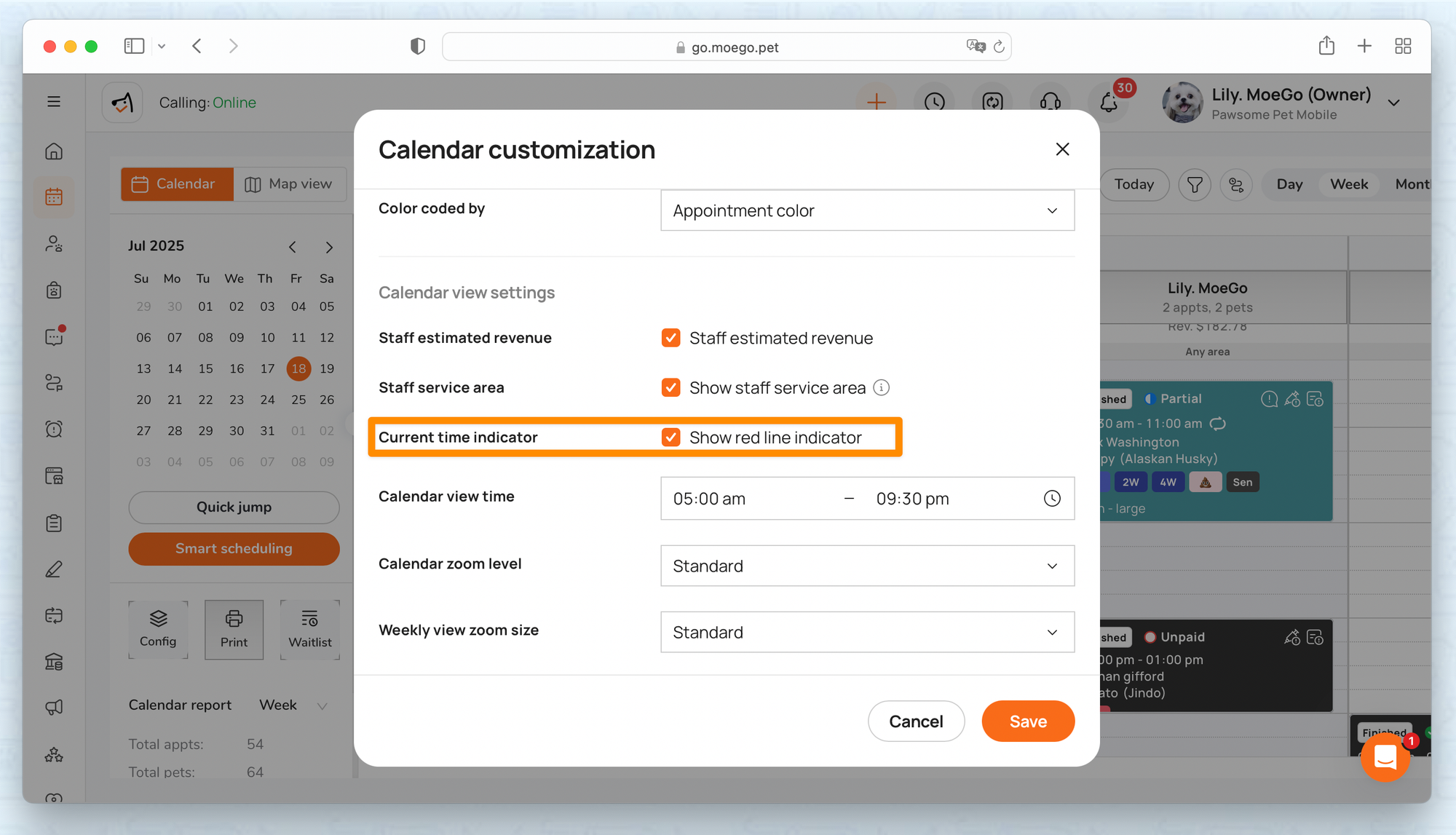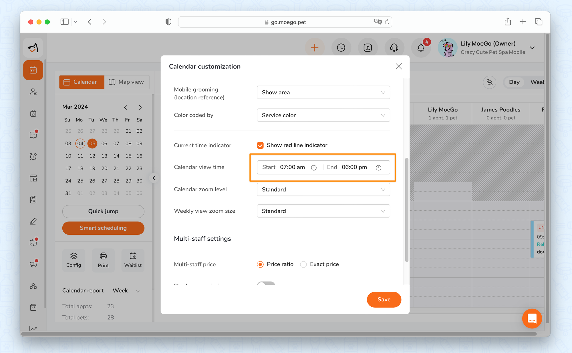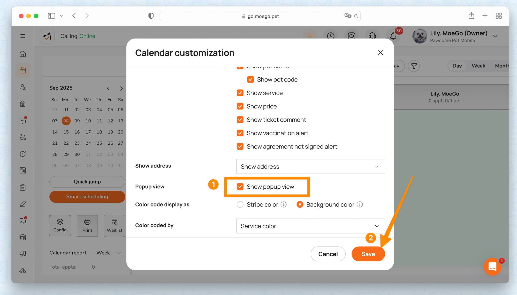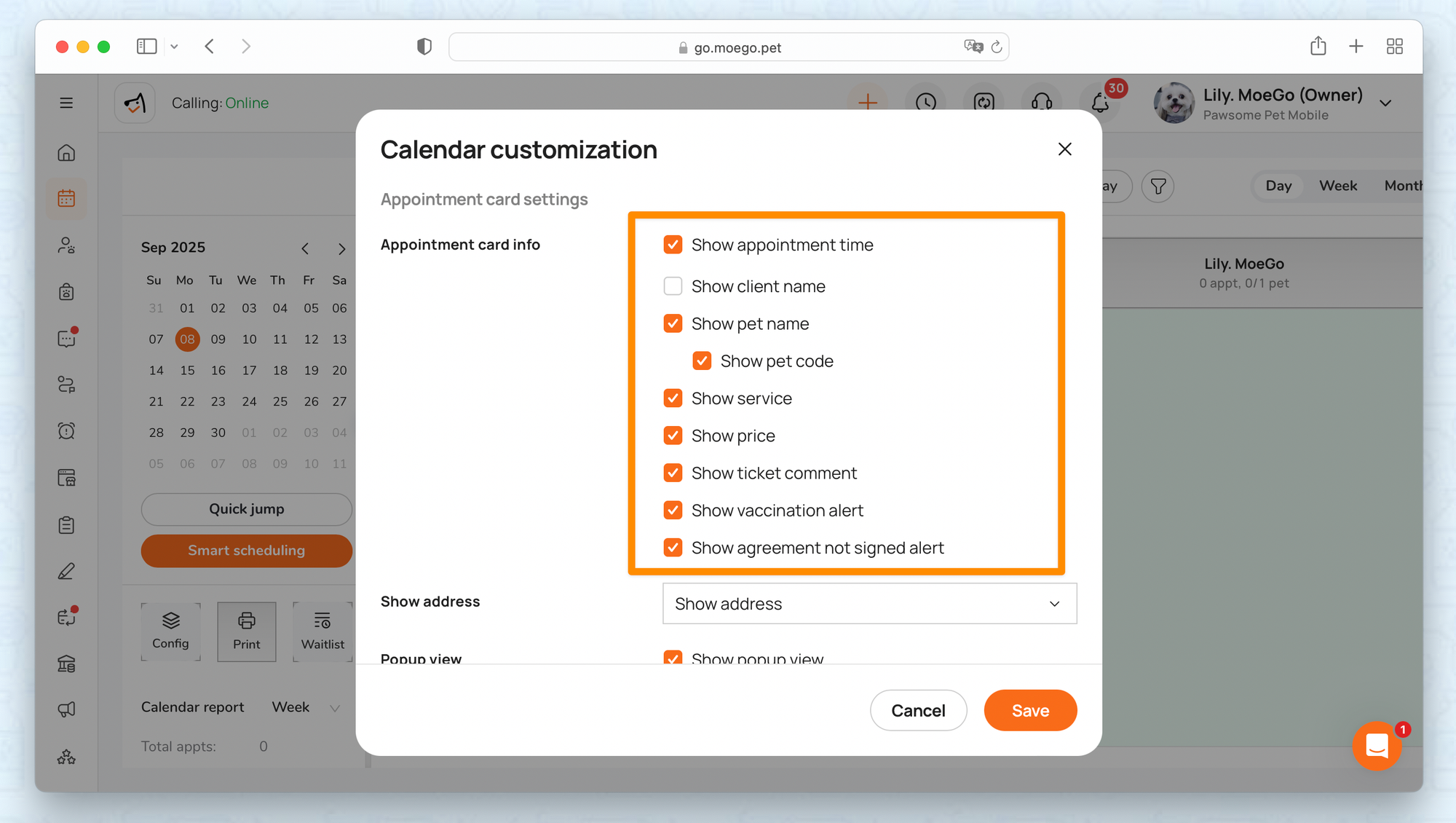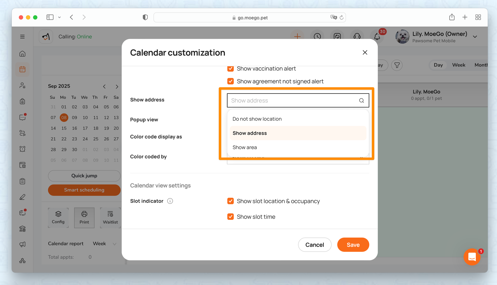 For mobile grooming businesses, you can customize what address information appears on your calendar: