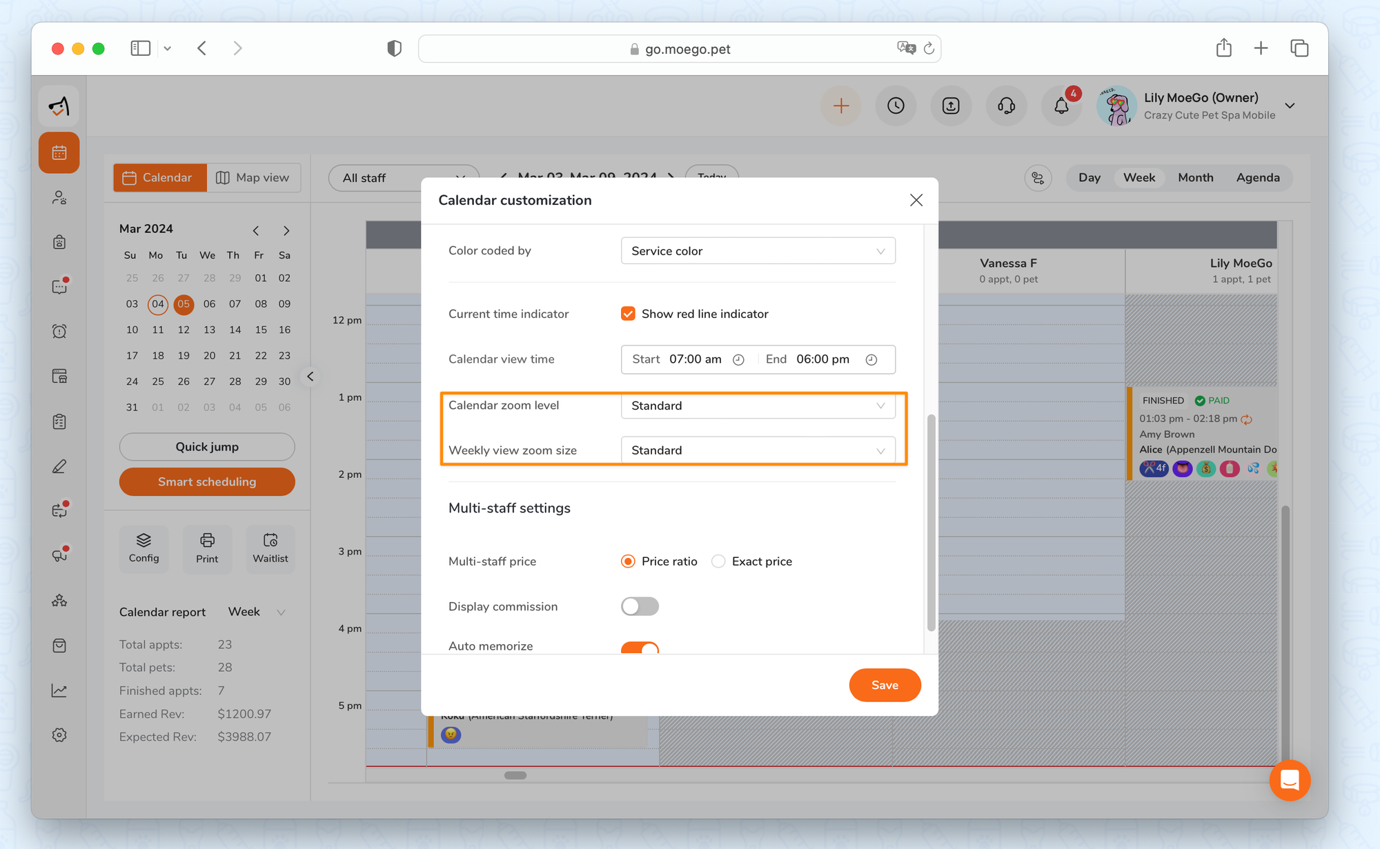 - Calendar Zoom Level: Choose your preferred zoom level — Standard, Large, or Extra Large. This helps you see more details on each ticket.