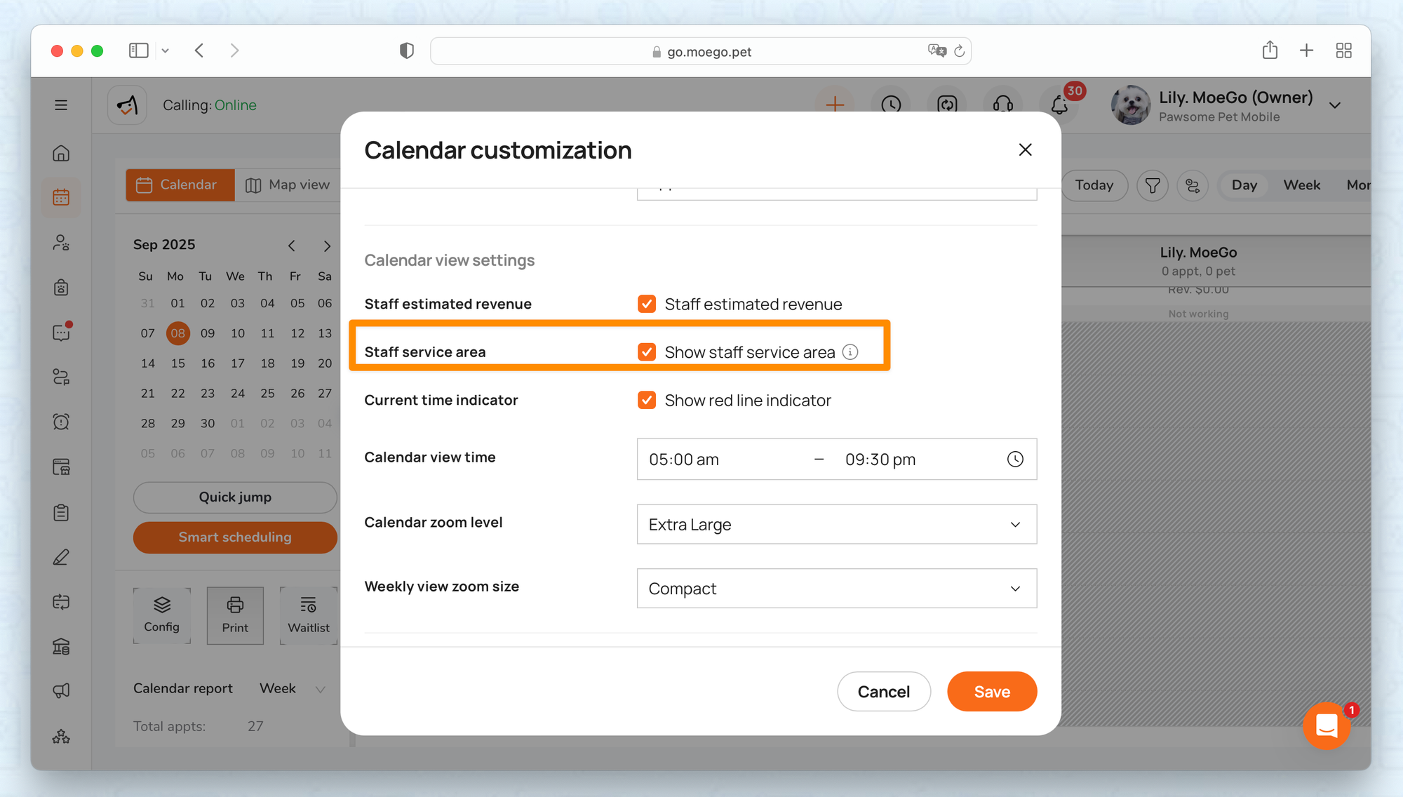 - Staff service area: You can also display each staff member’s assigned service area for each weekday directly on the calendar.