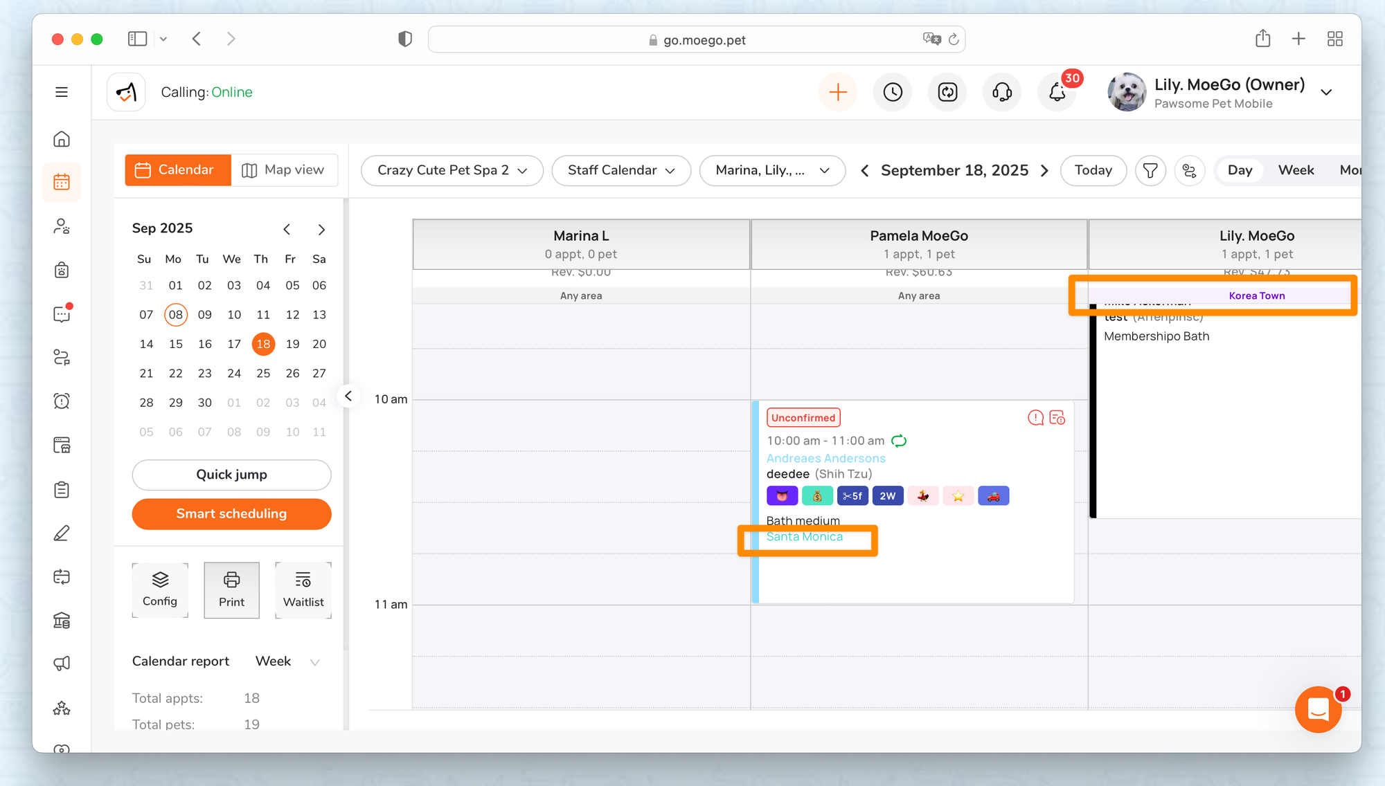 - For staff member Lily, the assigned service area on Thursday is Koreatown, displayed directly below her name.