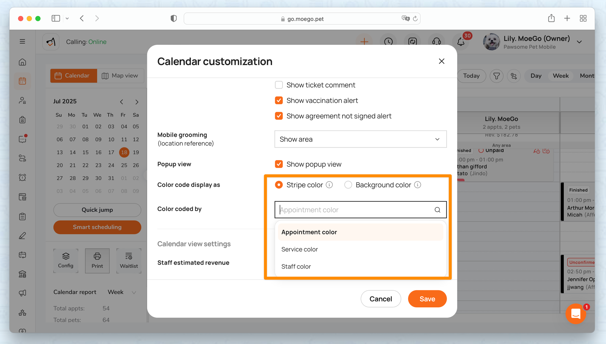 - Choose a color code type: Appointment color, Staff color, or Service color