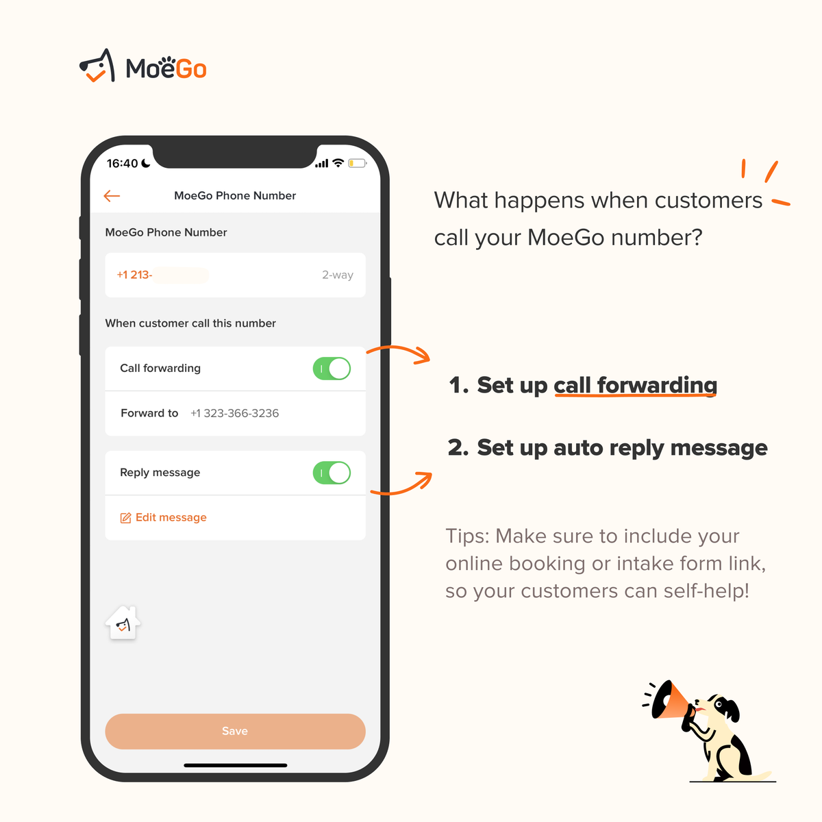 Now we've even made one more step for the MoeGo phone number, supporting call service as well. Other than messaging your clients, the call to this number can be forwarded to other numbers that work for you.