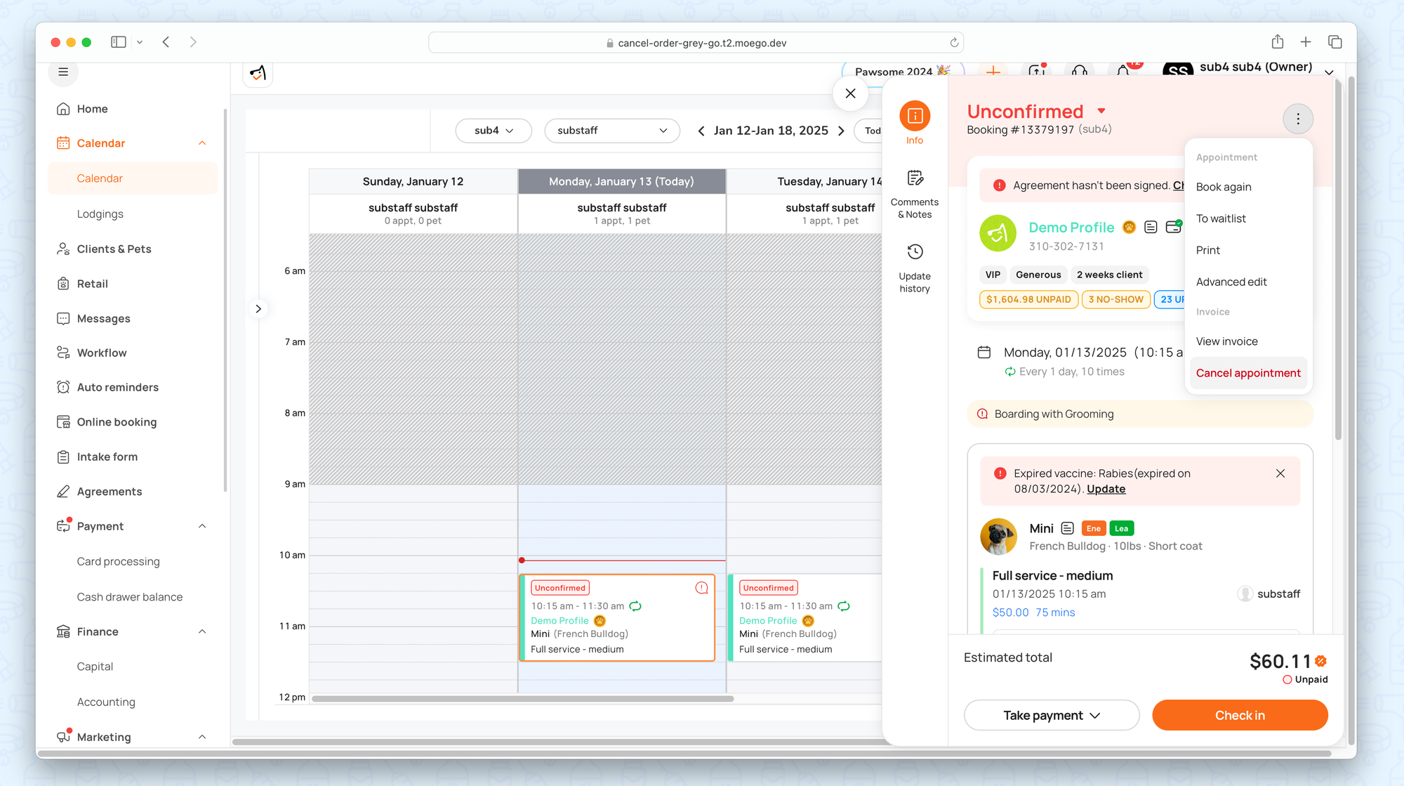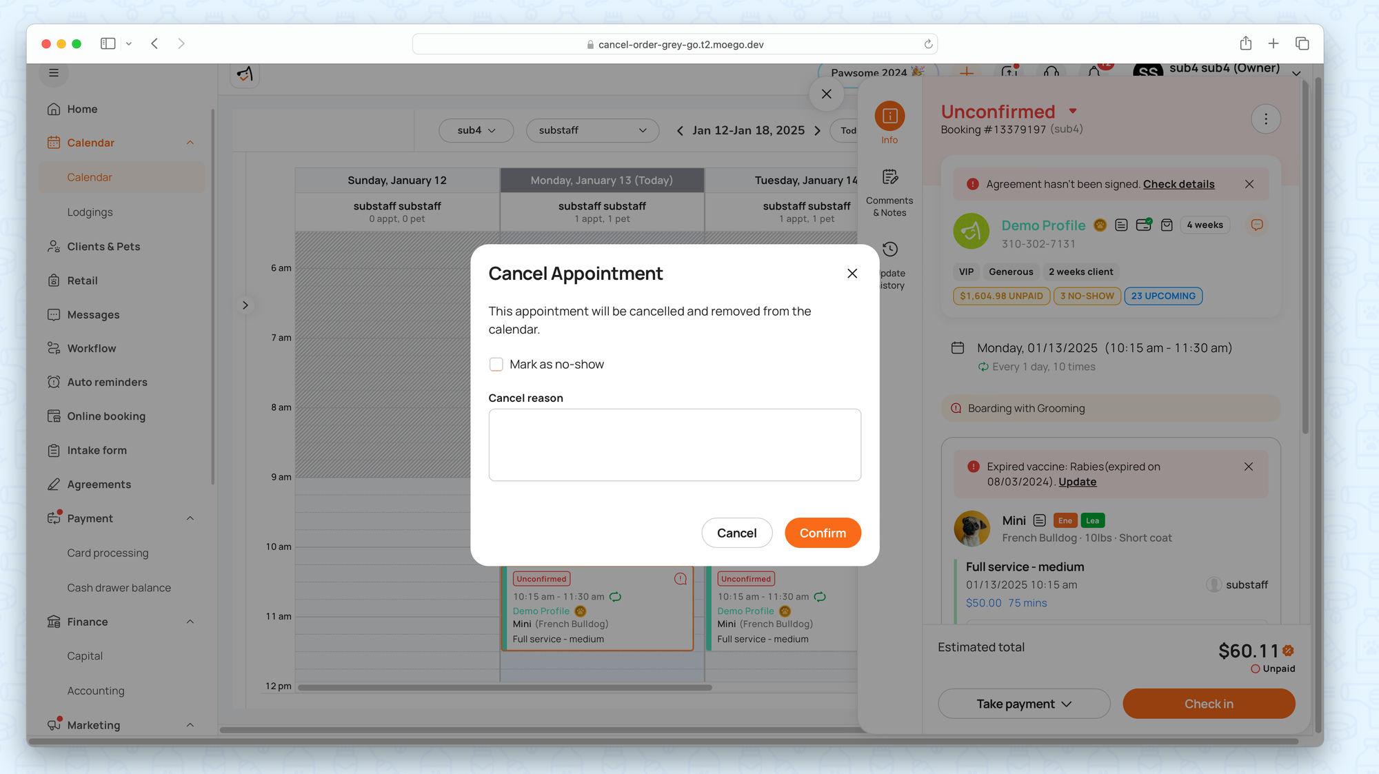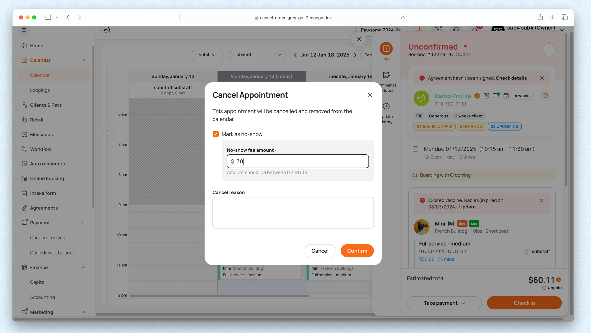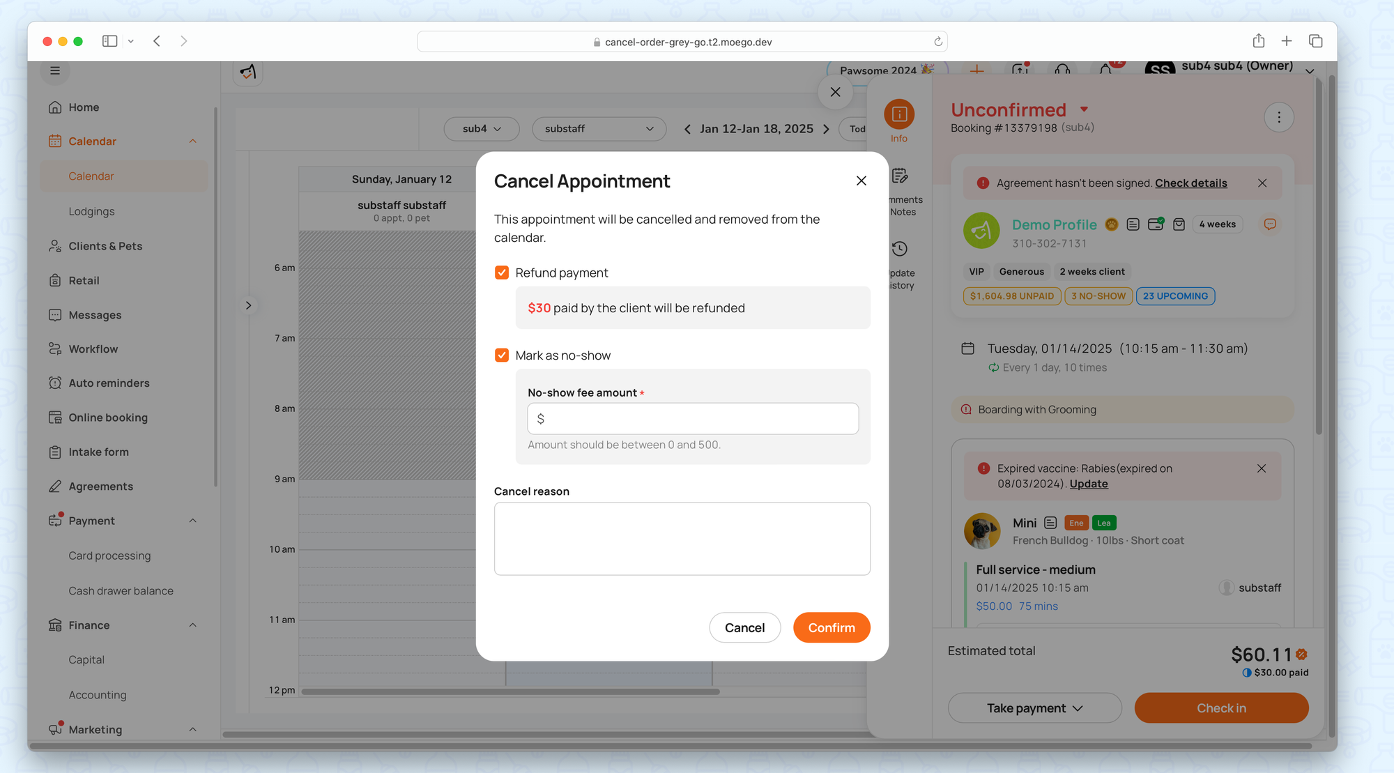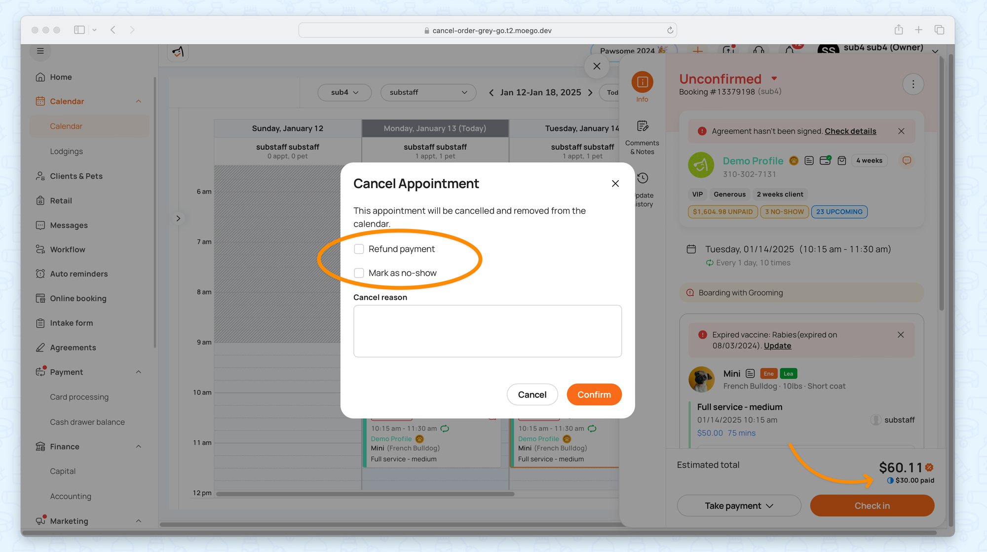 In this article, we will focus on how to handle cancel/no-show, ensuring accurate reporting and accounting. Based on the appointment status and payment status, you will be offered different cancel options to directly cancel, mark it as no-show, or charge no-show fees, or even refund the payment if there is any.