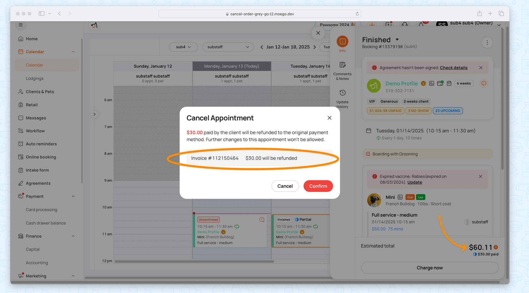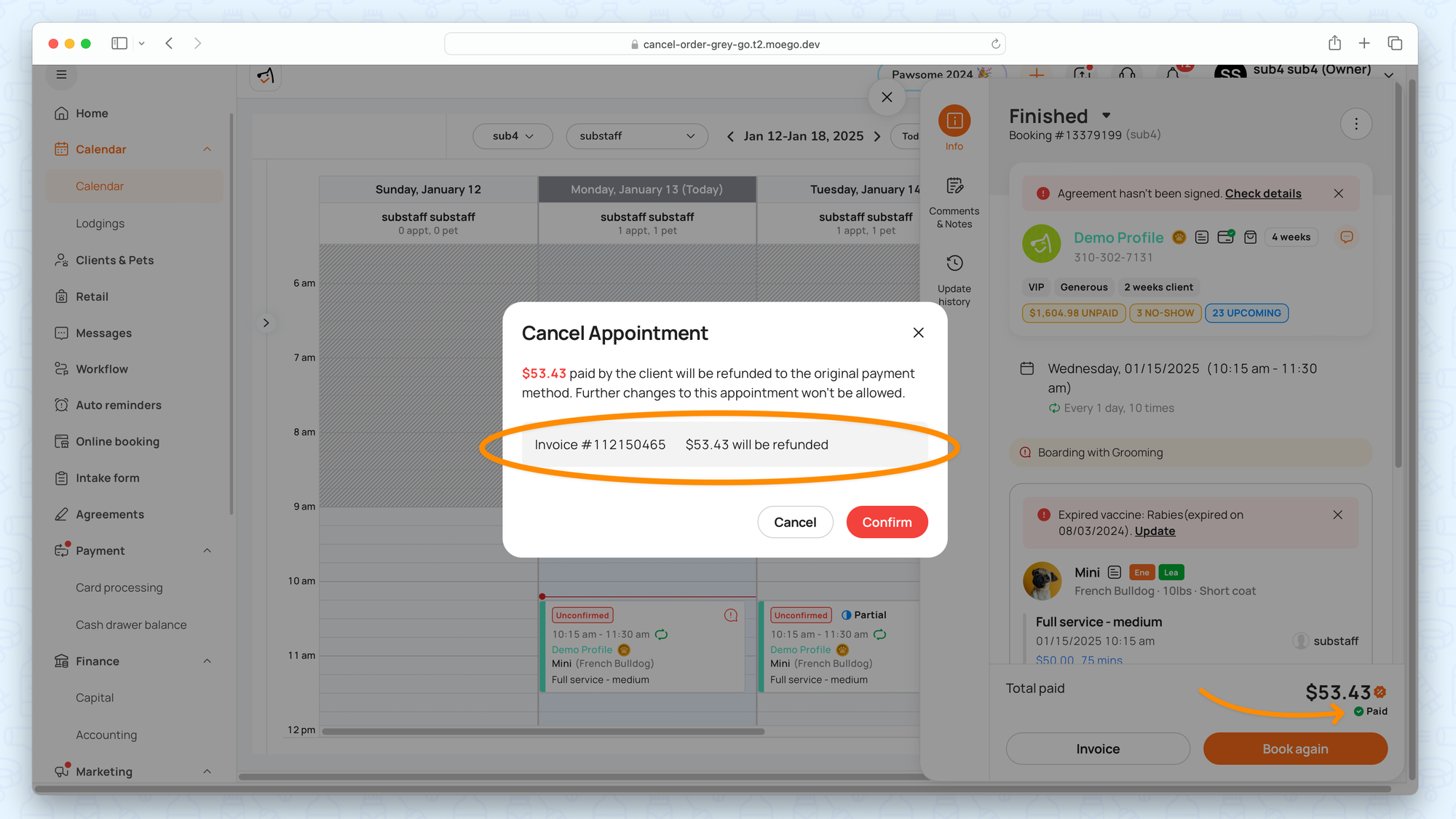 Note that the appointment cannot be canceled without a refund being confirmed. This prevents inconsistencies in reports and accounting by ensuring that finished and paid invoices remain final.