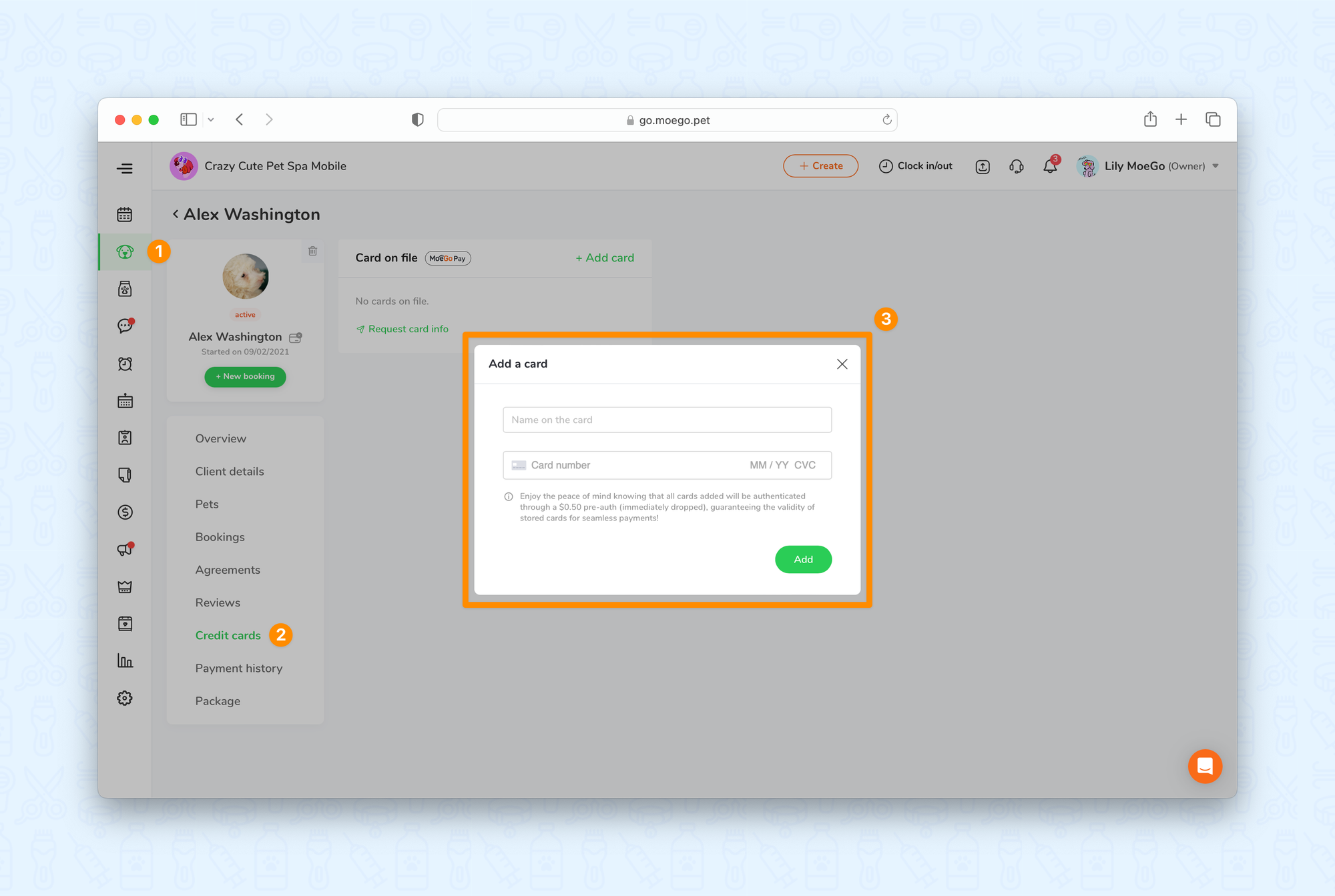 To manually collect card on file on the desktop you can do so by going to clients & pets > select client profile > credit cards > + add card > input card info > add.