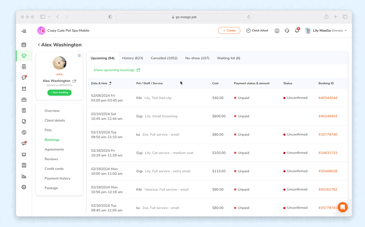 - Go to Client profile > Bookings > Cancelled