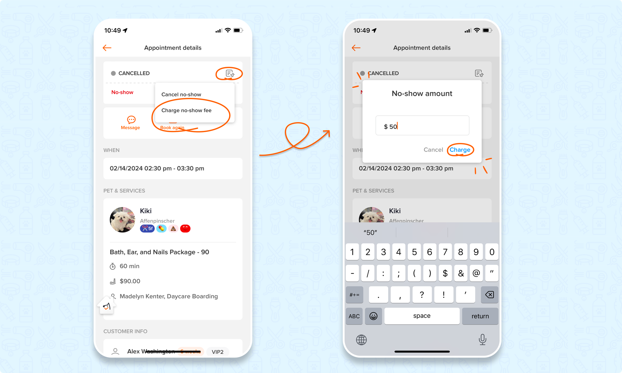 To charge a no-show fee on the app: