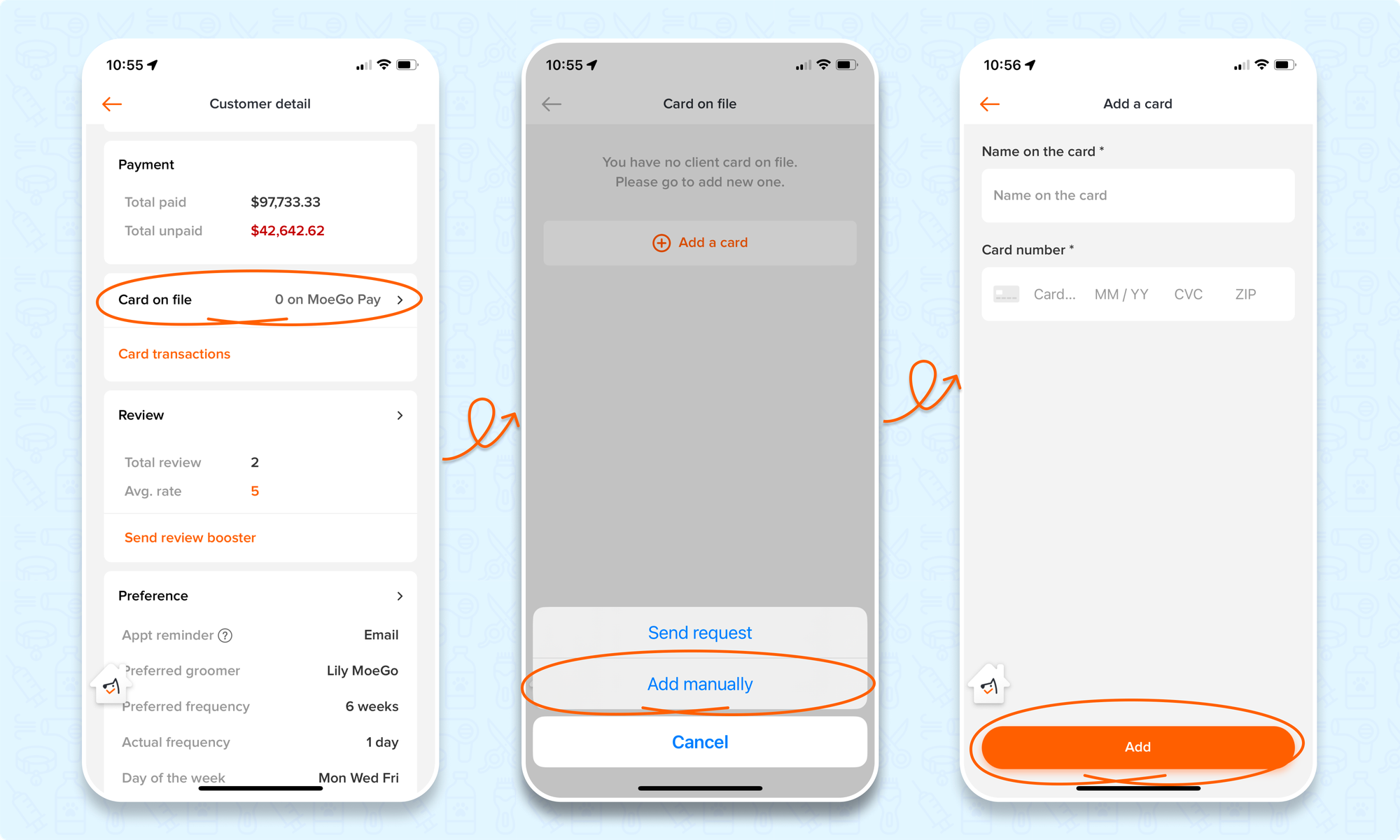 To manually collect the card on file on the app you can do so by going to clients & pets > select client profile > card on file > add manually > input card info > add.