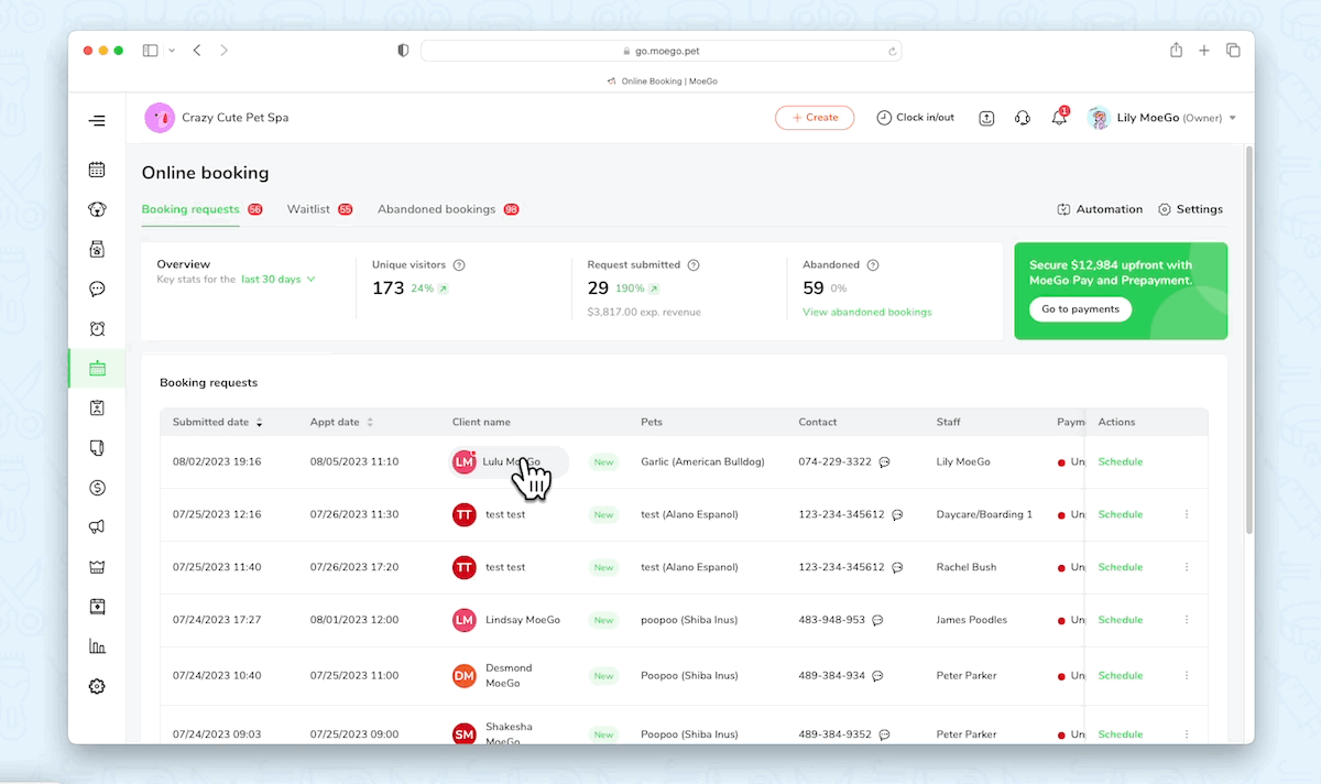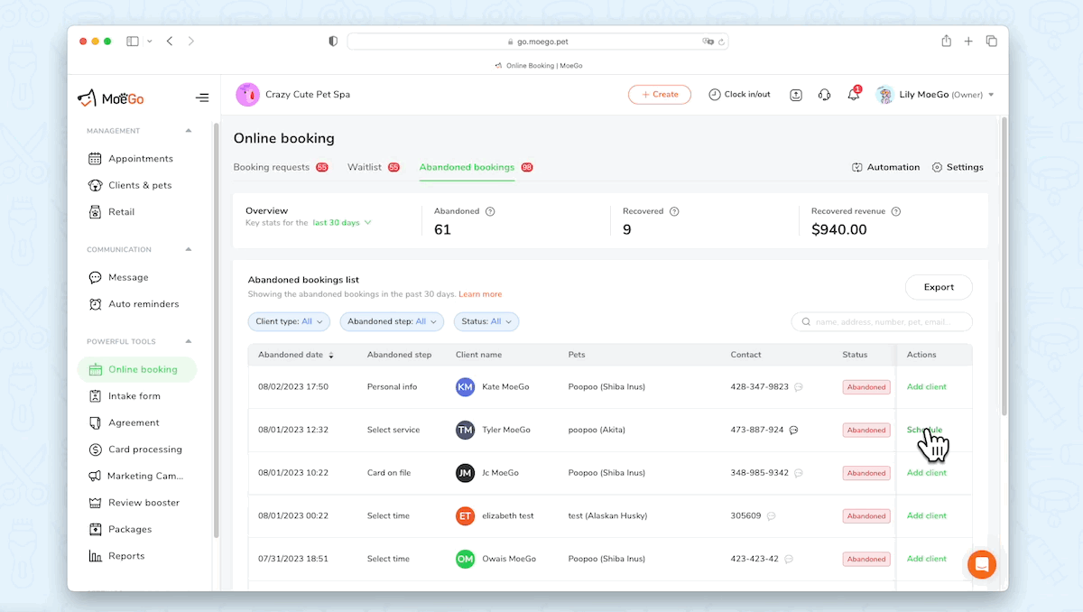 - Go to Online booking> Abandoned booking, and click on < Schedule > to book for abandoned clients.