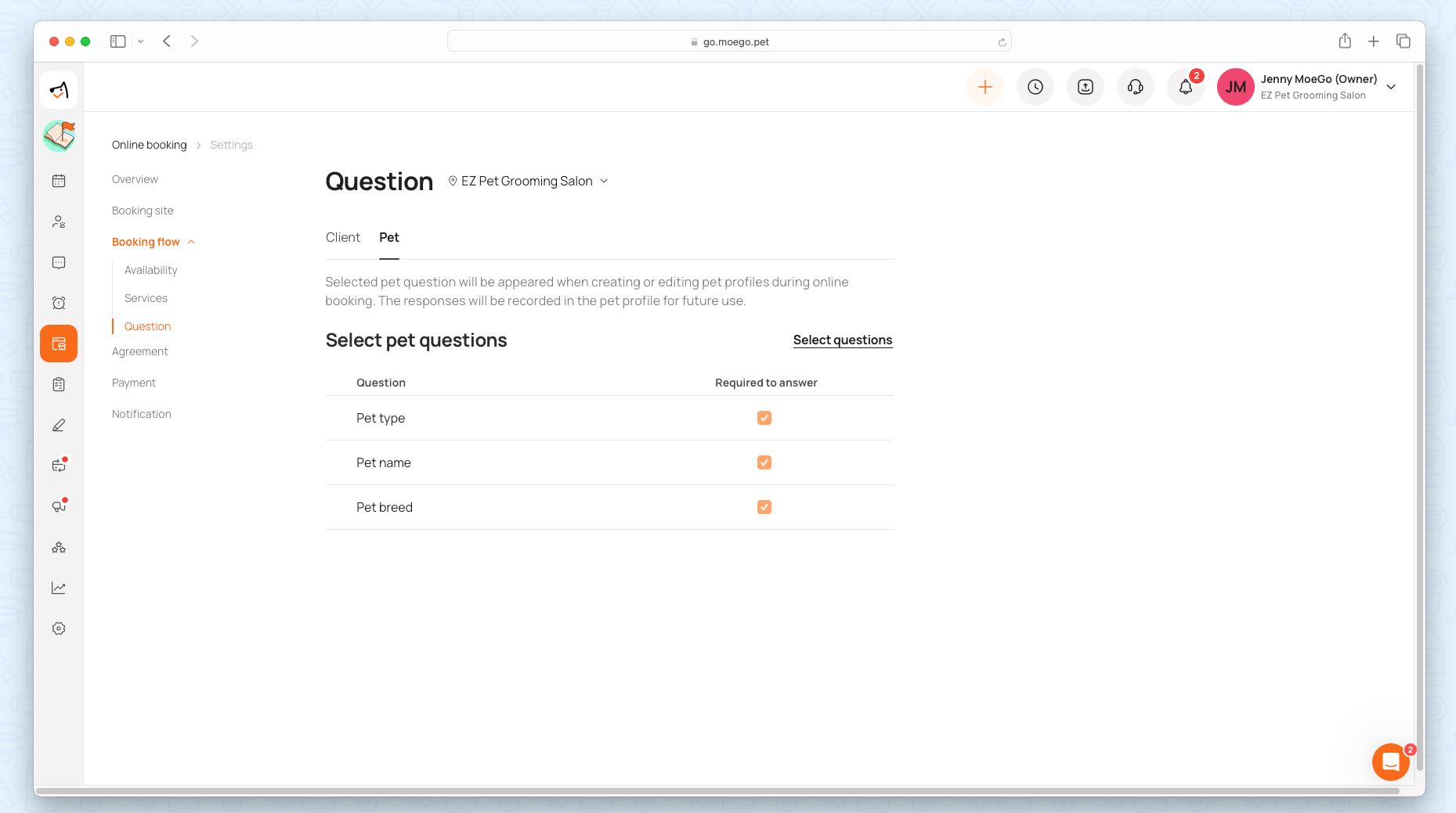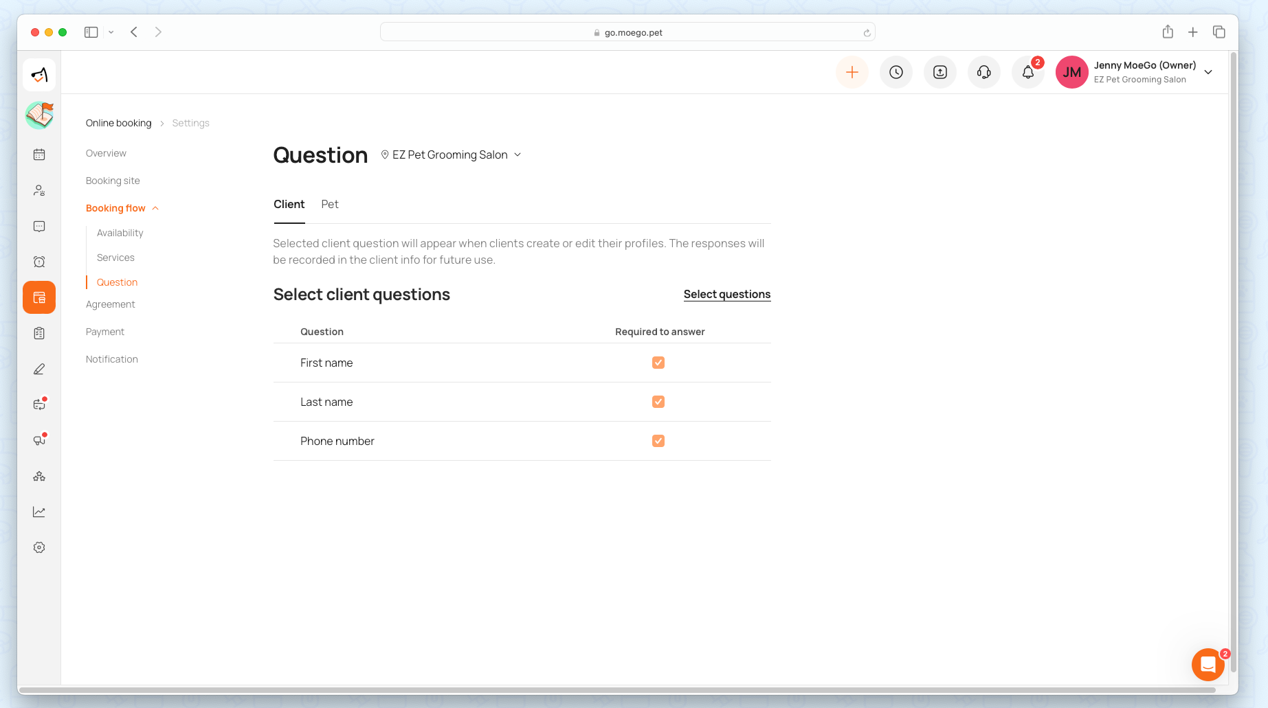 During the Online Booking Process, clients can update their existing pet information by editing the information form. You can set up the required information for the pet info in Online Booking > Settings > Question > Pet.