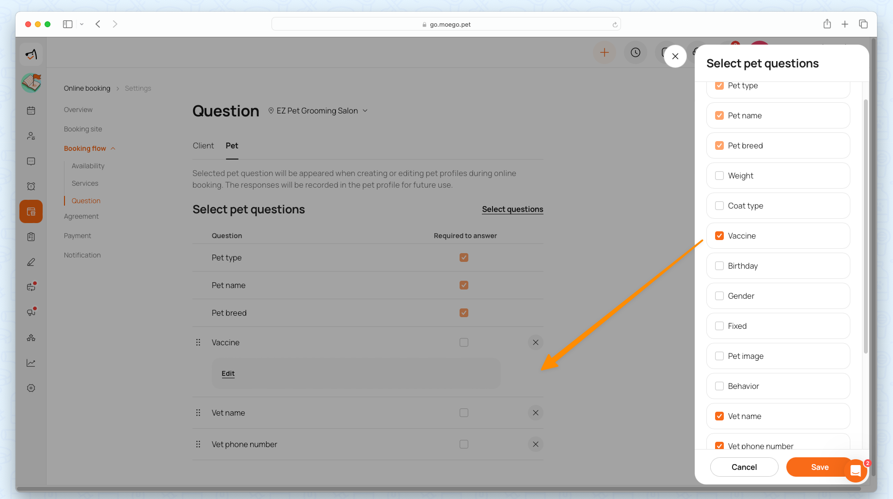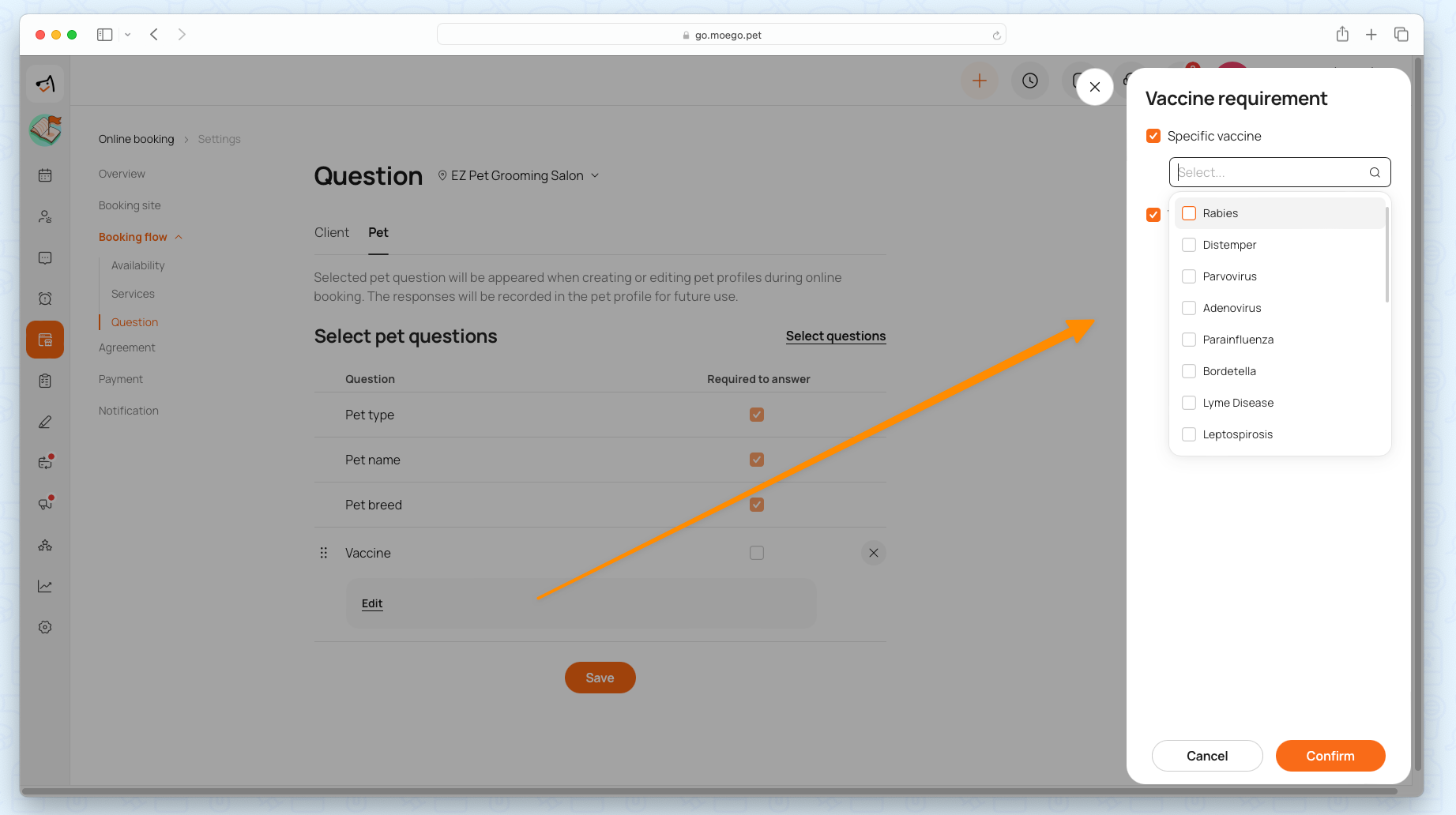 Additional pet questions to set the vaccine as required information and you can click < Edit> to set specific vaccine requirements based on your business need.
