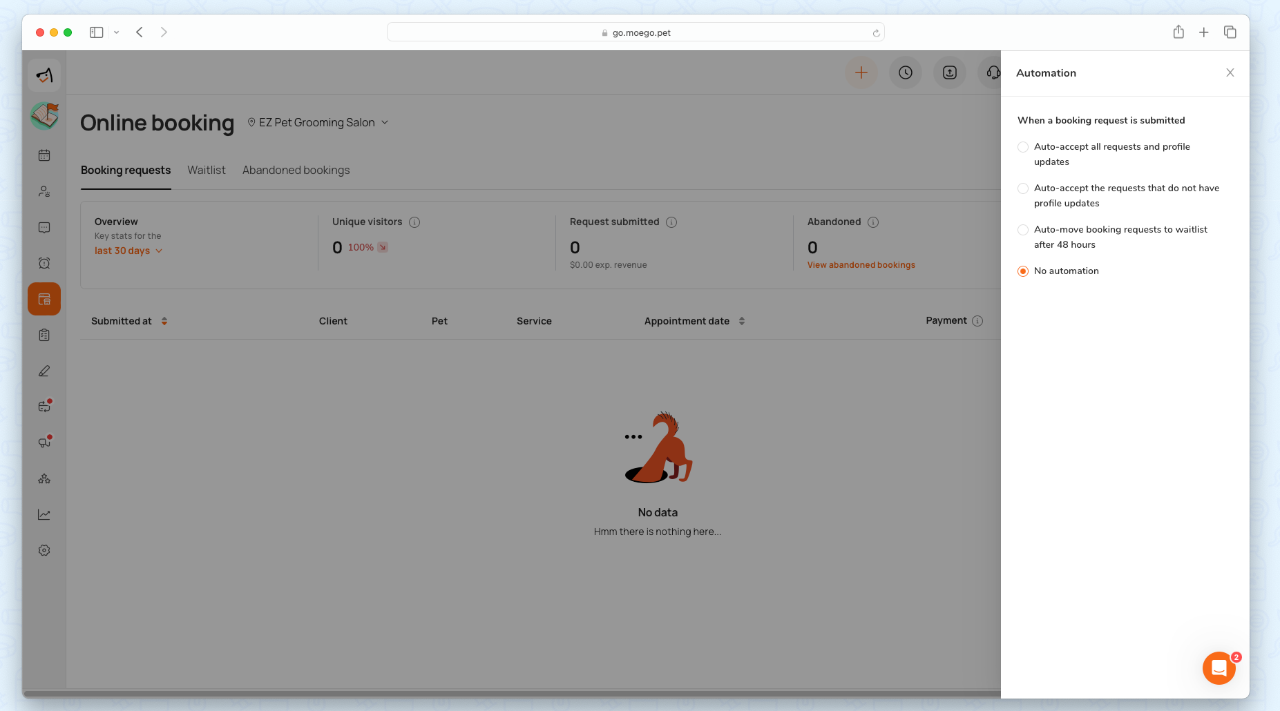 If the pet profile has information missing based on your setup, the system will automatically ask the clients to fill in the information. The clients need to update the required information before they can continue booking.