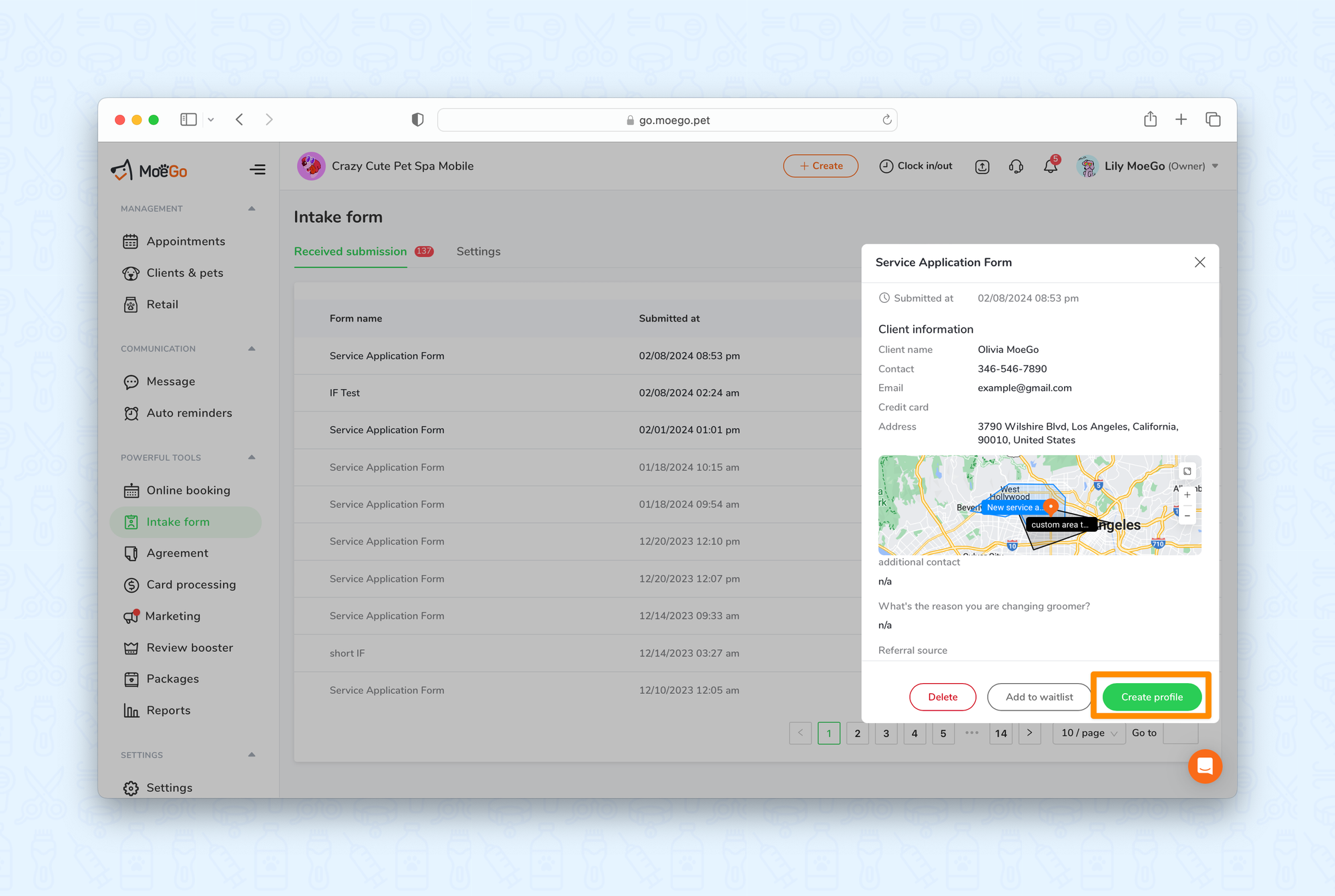 Another excellent method for adding new clients to MoeGo involves leveraging the intake form feature. Clients can conveniently complete the intake form either in person or via text messaging. Upon submission of the form, seamlessly add the client from the intake form submissions view.