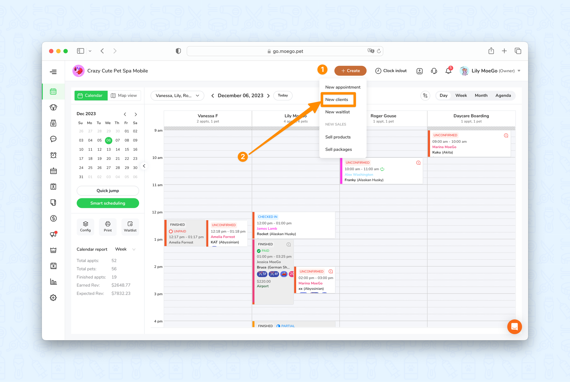 Answer: In the client profiles, you can find client details (contacts, notes, tags, preferences, etc), pets (pet details, notes, vaccinations, medical information, photos), bookings, agreements, reviews, credit cards, payment history, and packages sold.