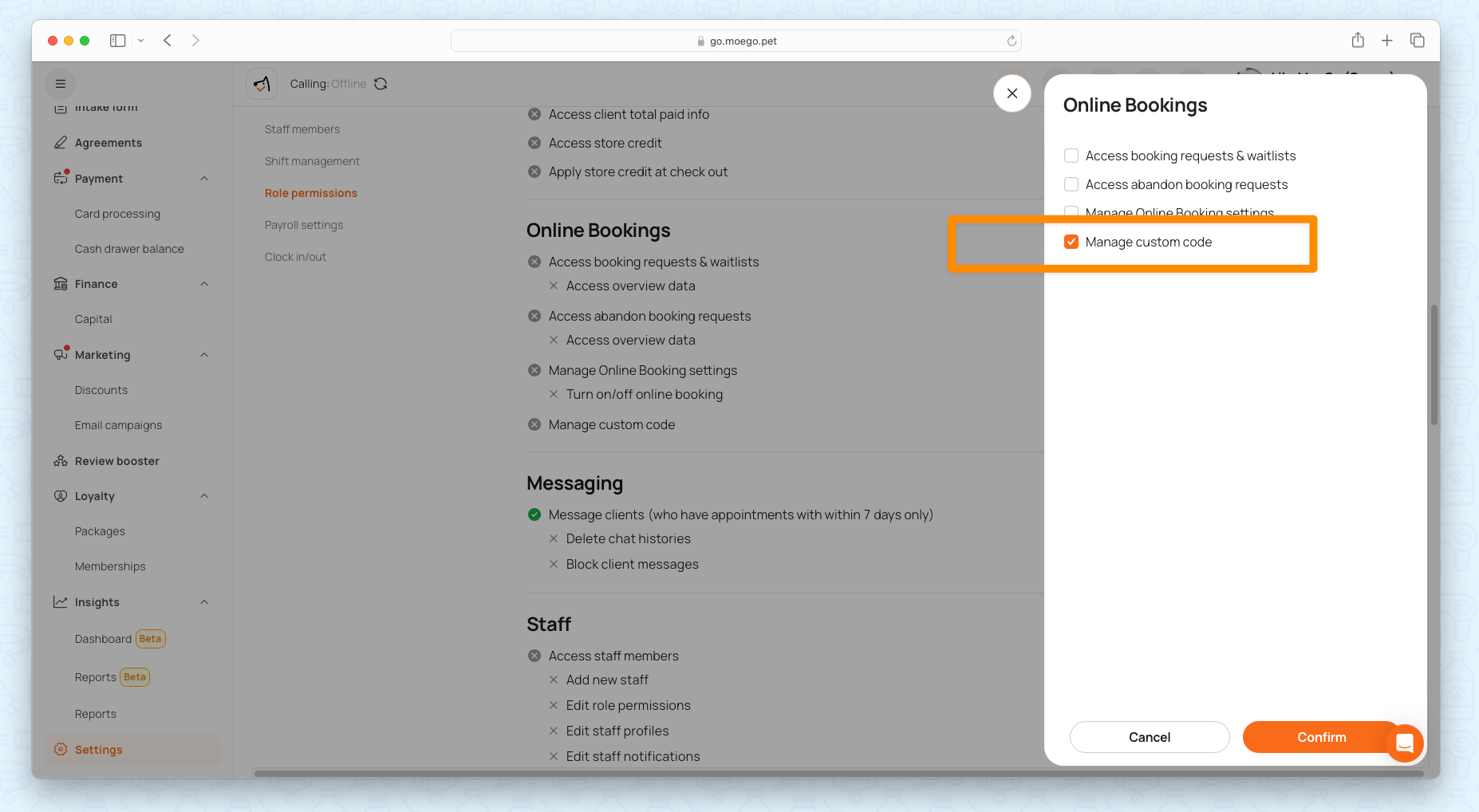 💡 Permissions Reminder: Staff must have the “Manage custom code for online booking” permission enabled (Settings > Staff > Role Permission > Online Booking).