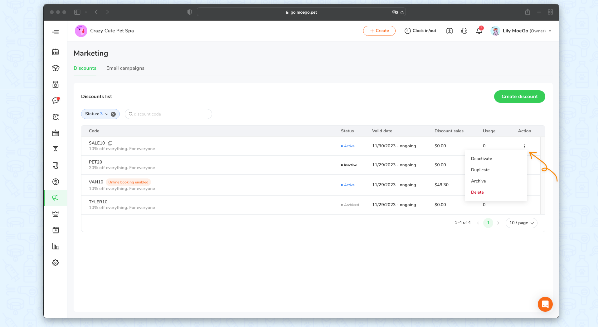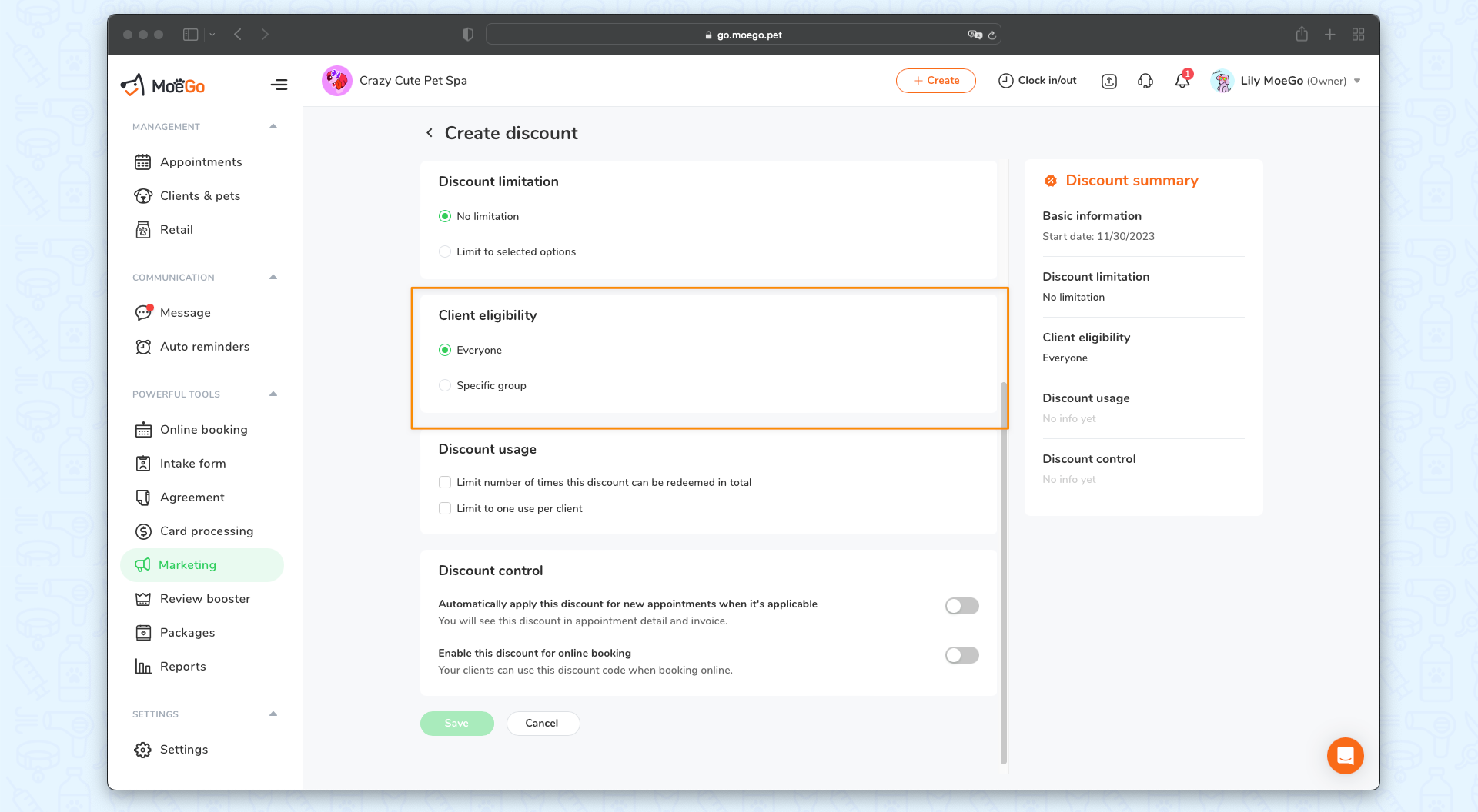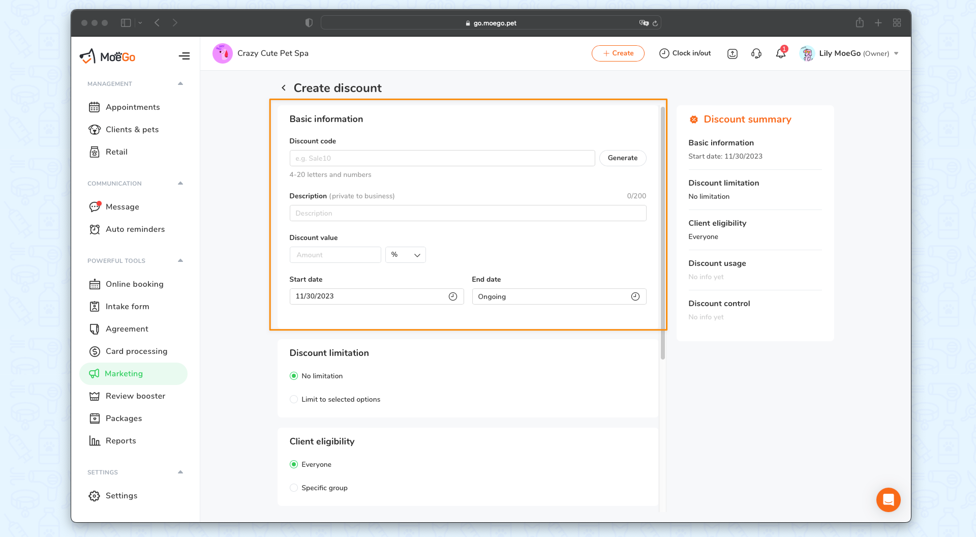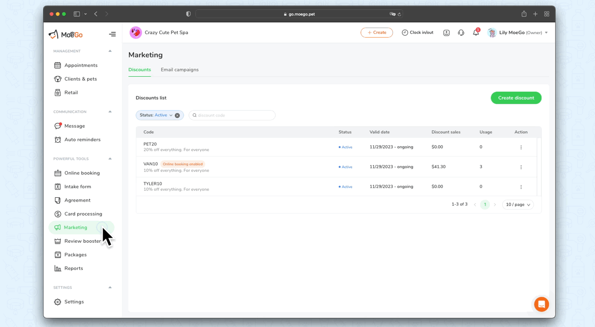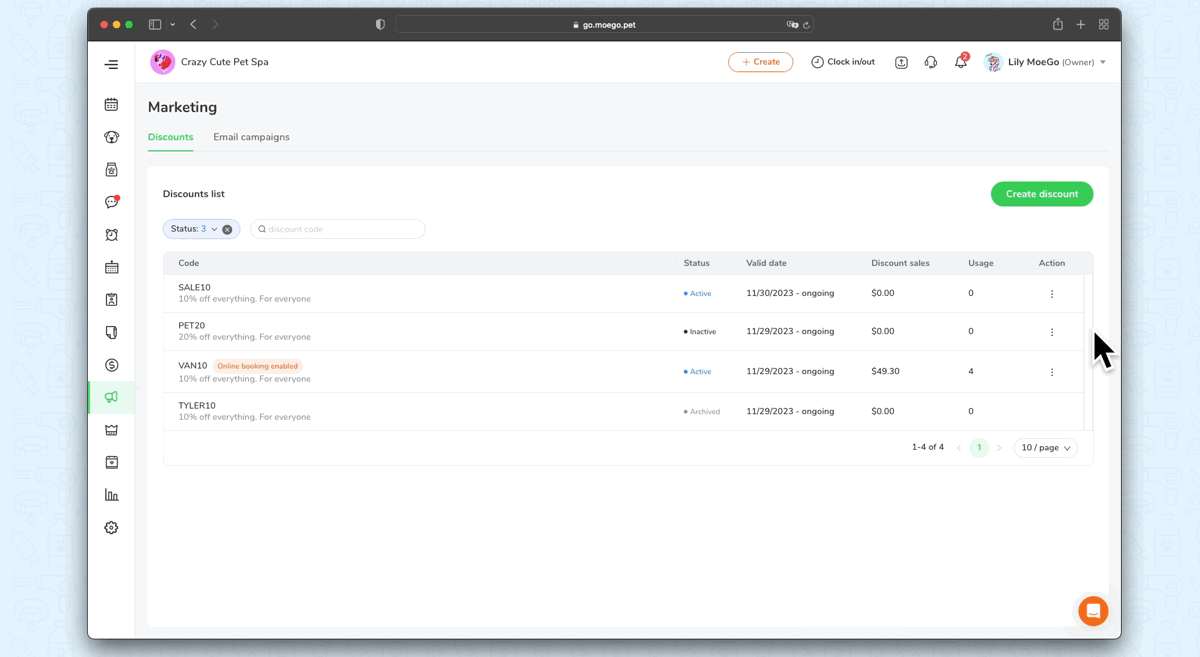 We have launched a Discount Module in MoeGo that you to create flexible discounts for your clients. You can set a specific start and end date, define a limited number list of services, add-ons, and products it can be applied to, and set client eligibilities by integration with advanced filters.