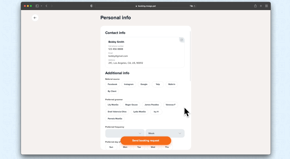 Your client can also apply an active discount code during online booking. On the Personal Info page, your client can click < Enter discount code > to apply for the promotion. You can set limitations and control which specific clients can use a certain discount code. Please refer to the previous sections on setting client eligibility, discount usage, and discount control to learn more.