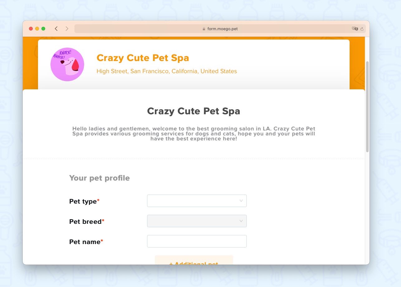 - For new customers, click on < Create profile >, a new profile will be saved for both pet and pet owner