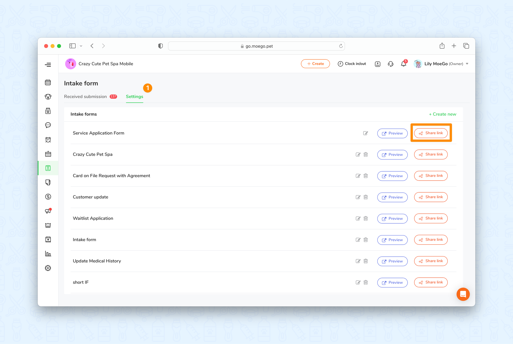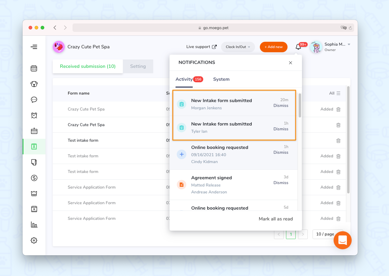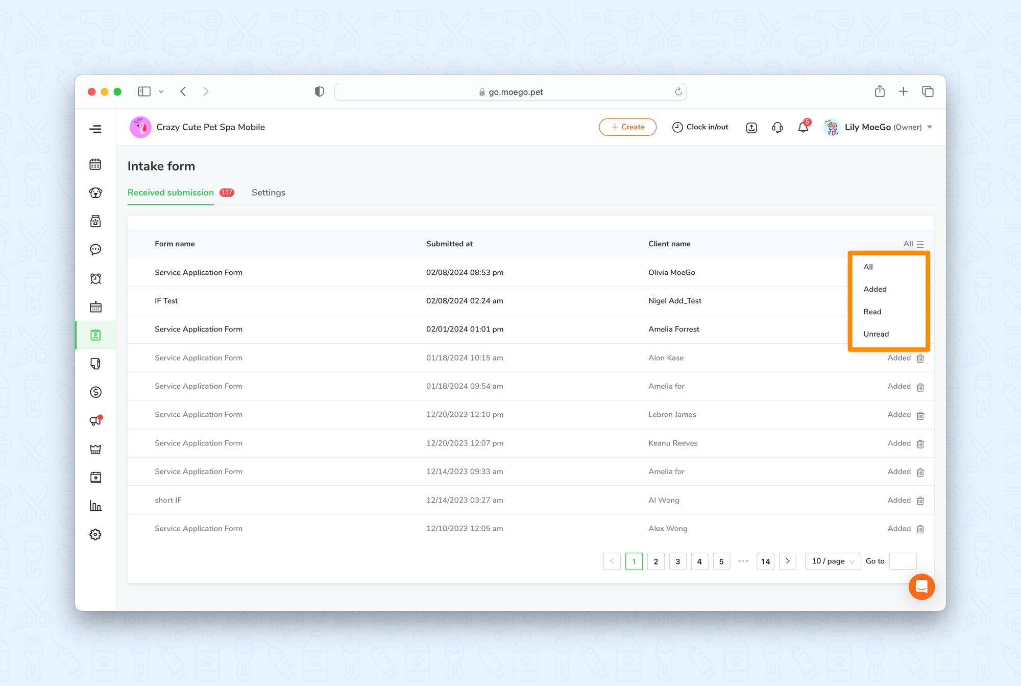 💡Please note: intake form submissions can only be filtered on the desktop version of MoeGo.