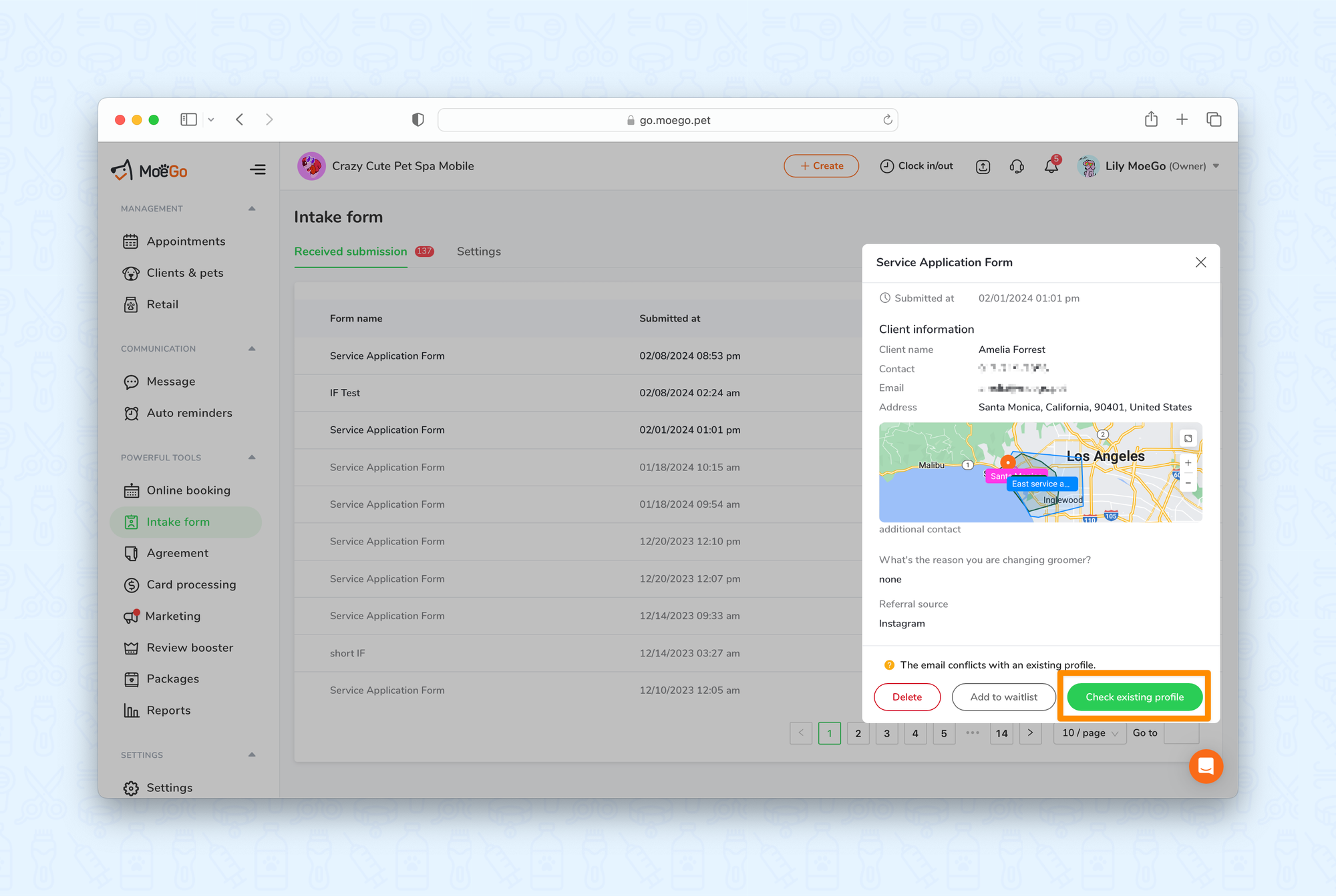 For existing customers (with the same phone number and email), click on <Check existing profile >, and then click < Merge >. The merge option will appear if the intake form has the same email address/phone number as an existing client.