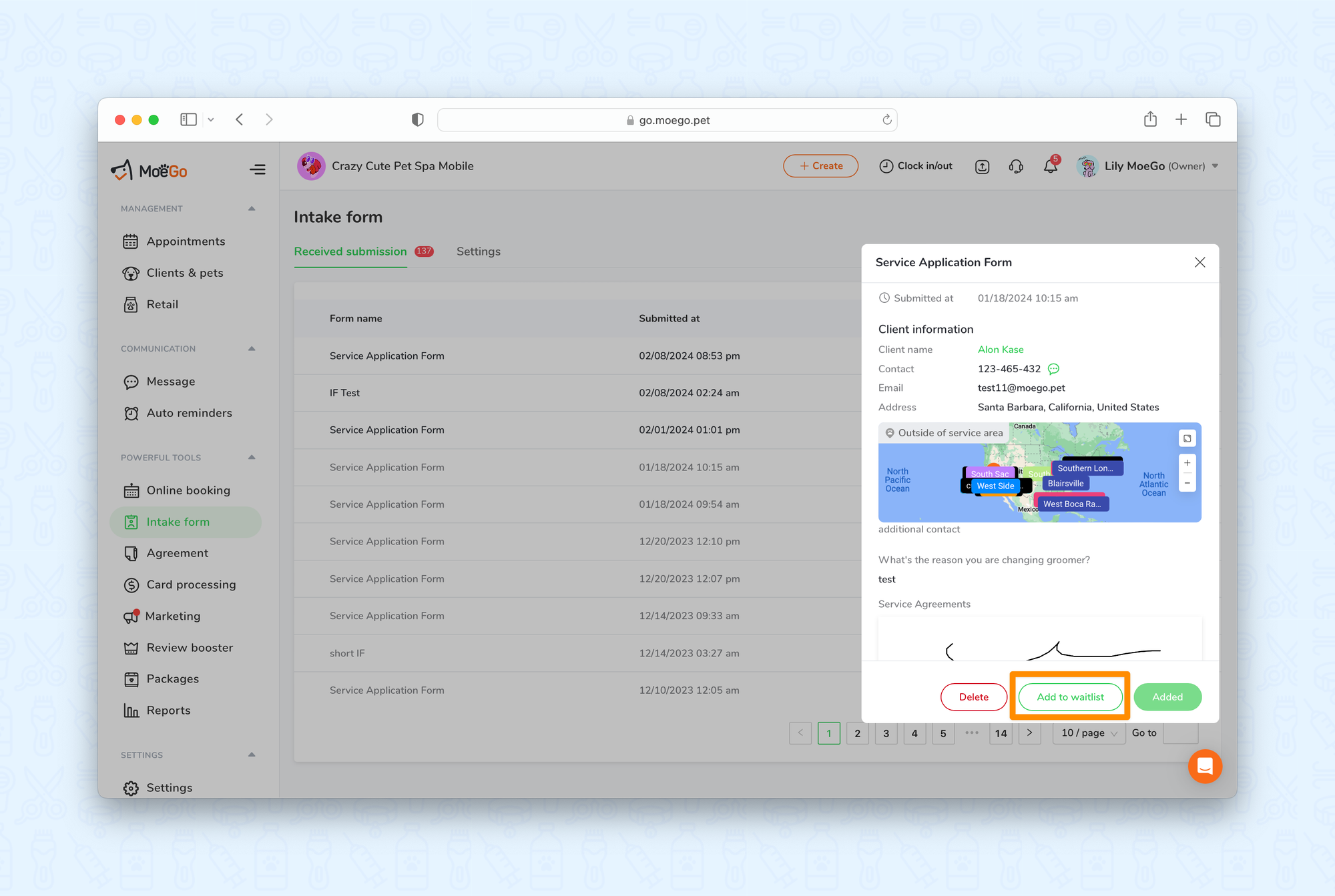 MoeGo Intake Form is a tool for you to gather information from potential new clients. You can fill it up in person and also send the intake form link via text or email to your client. Here is a guide on how clients can submit the forms and how to organize received forms.