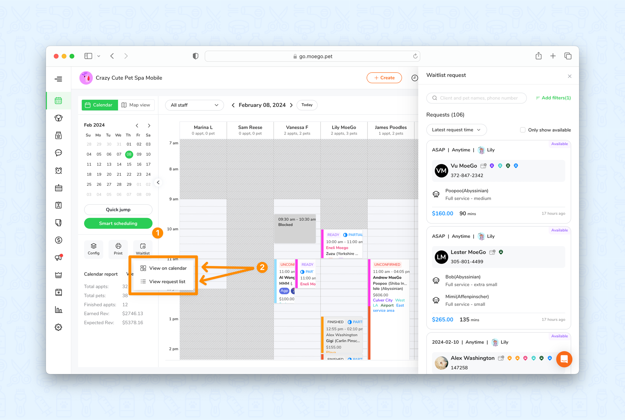 6. Go to Appointments > Waitlist. Click on < Waitlist >, then select < View on Calendar > or < View Request List > to expand your waitlist to a detailed view.