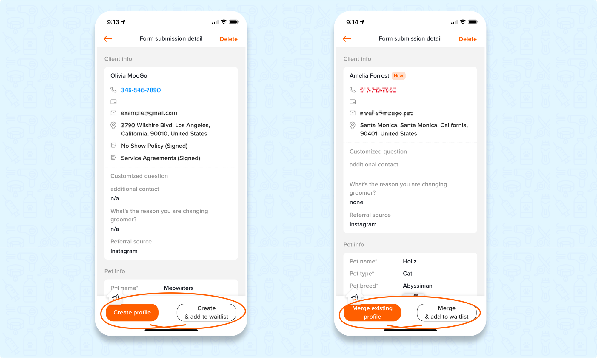 For existing customers (with the same phone number and email), click on < Merge existing profile >, and then click < Merge >. The merge option will appear if the intake form has the same email address/phone number as an existing client.