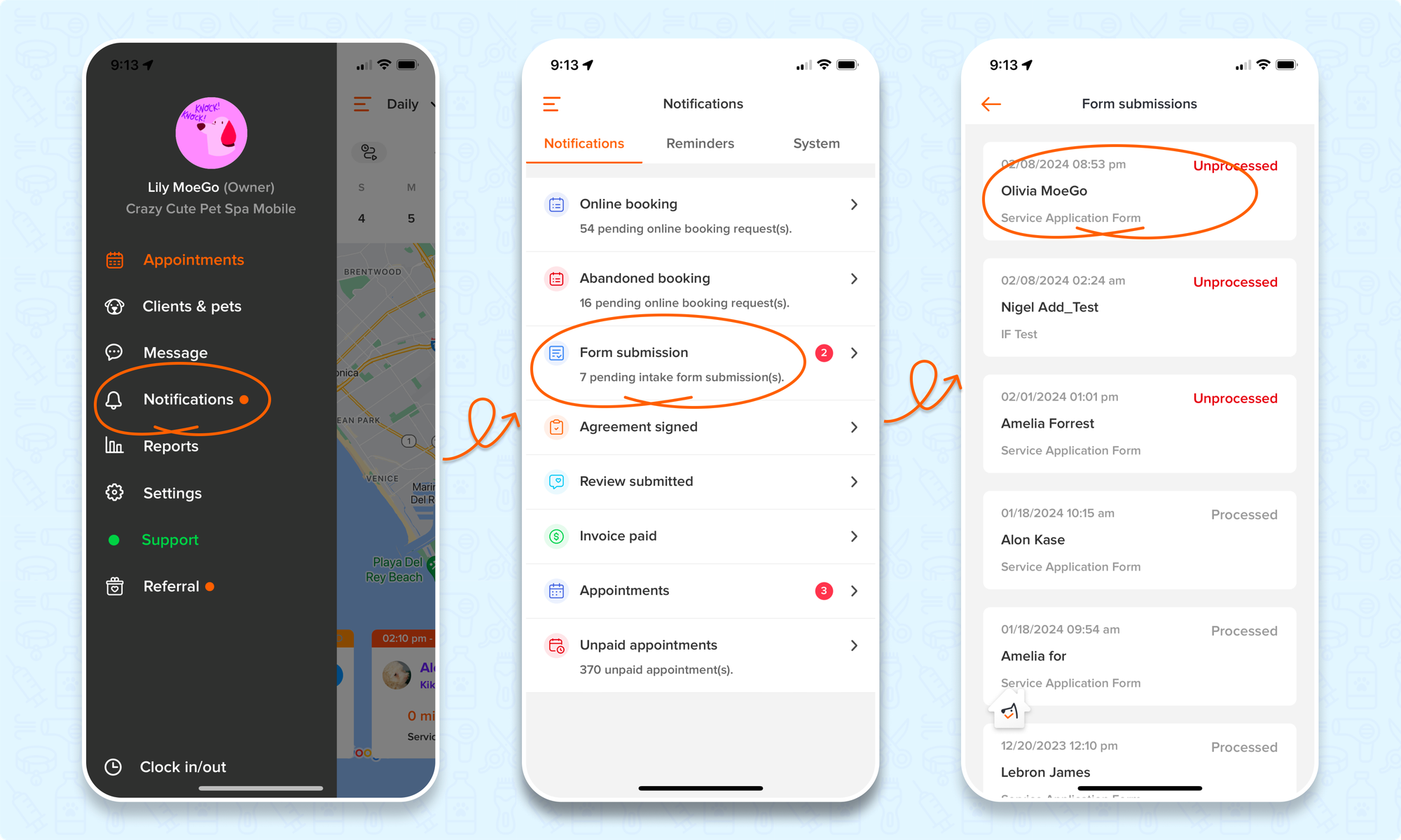 Once someone submits an intake form, a notification will appear in the < notifications > section on the left side menu of the app.
