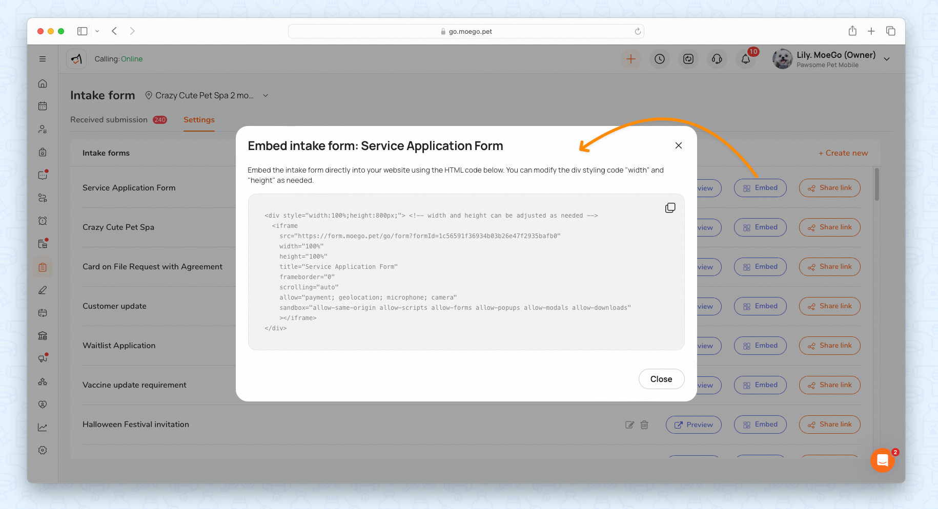 To embed your intake form from a desktop go to intake form > setting > embed. Click on < Copy > to copy the generated HTML code.