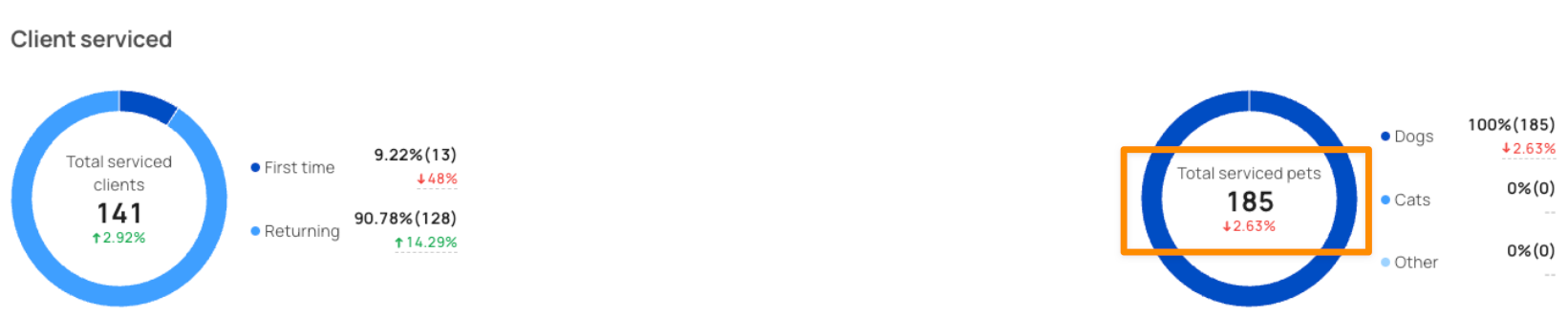 No. The total pets serviced refers to the number of pets that all staff have serviced during the period. There could be duplicated pets in this number as one pet can be served more than once in the selected time range.
