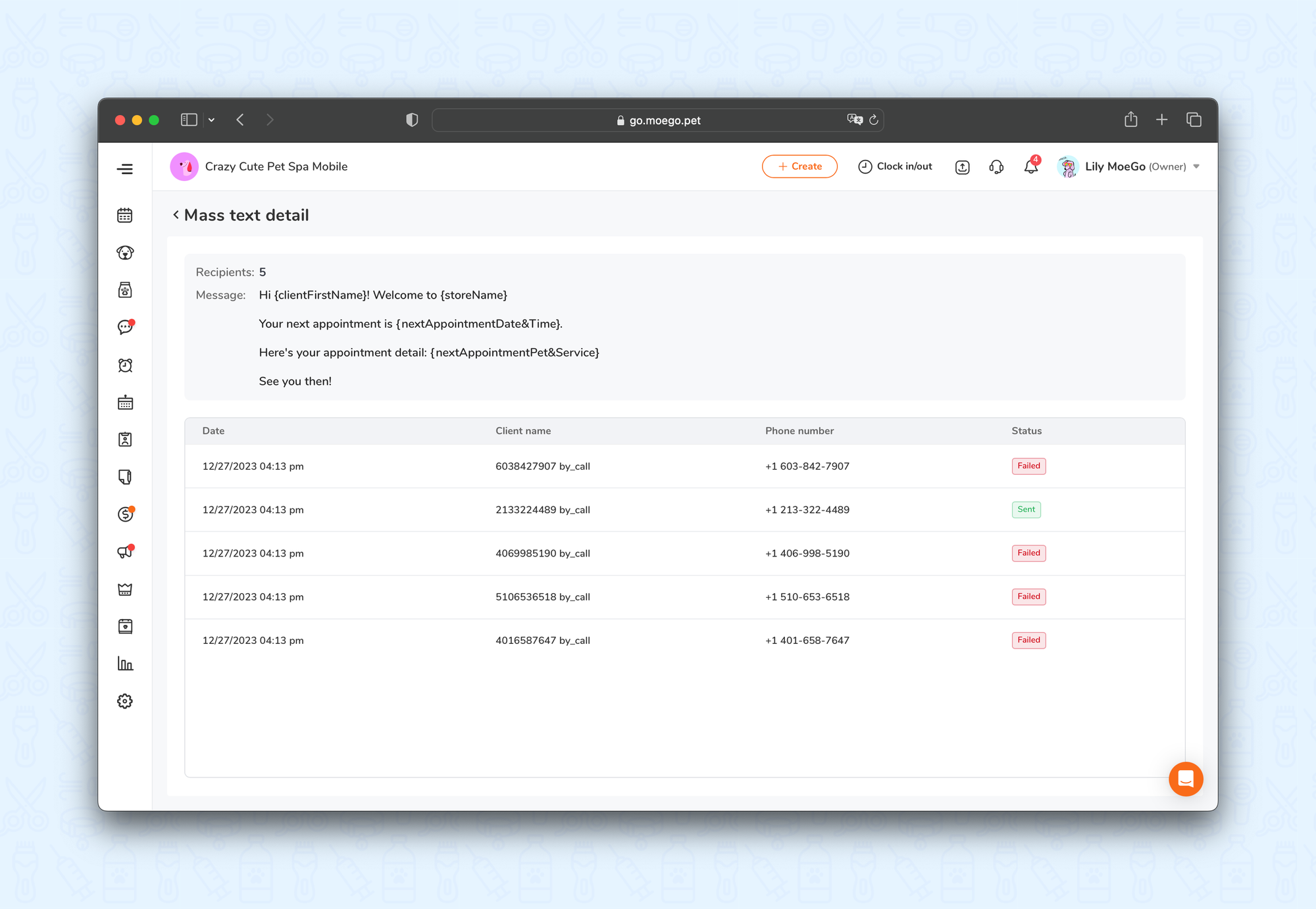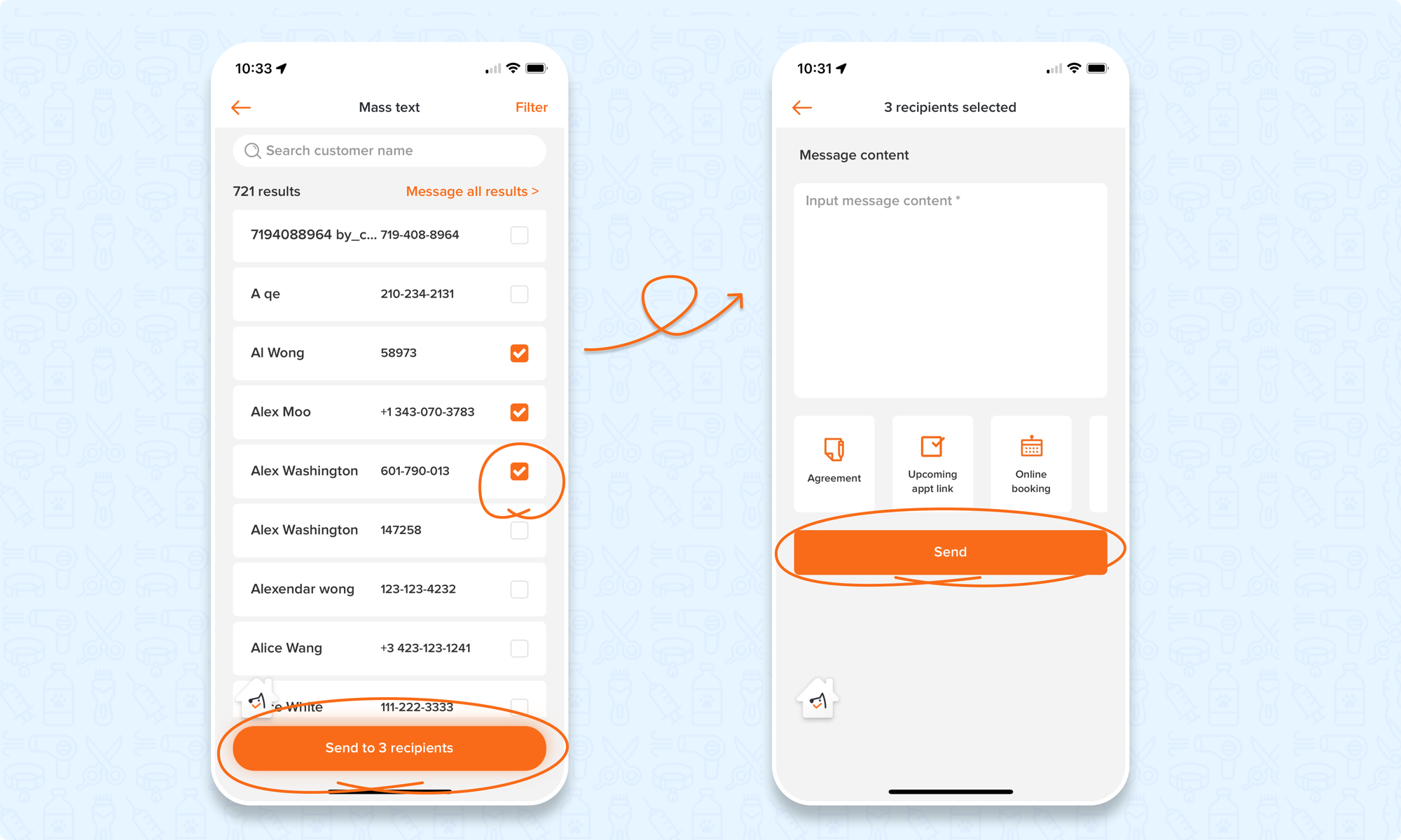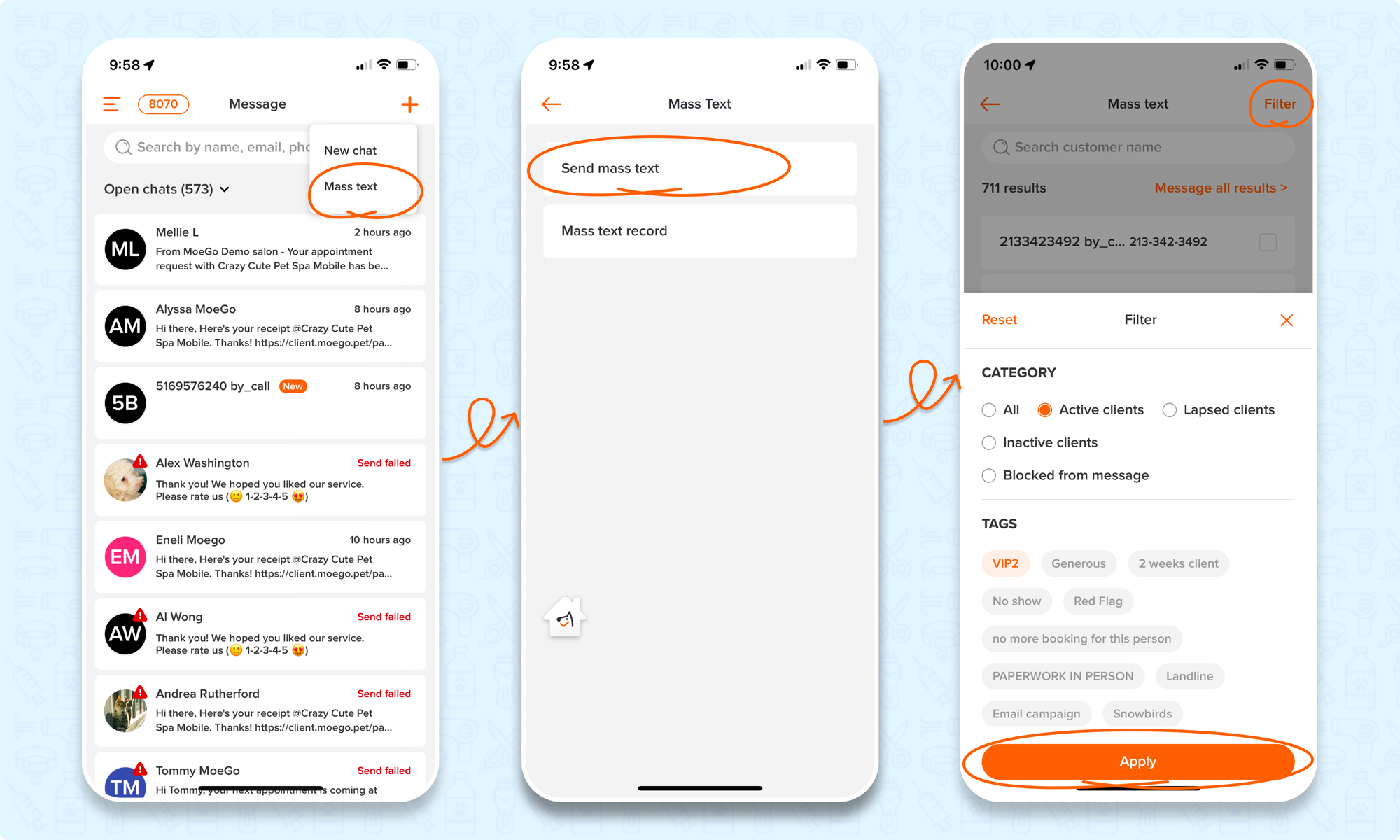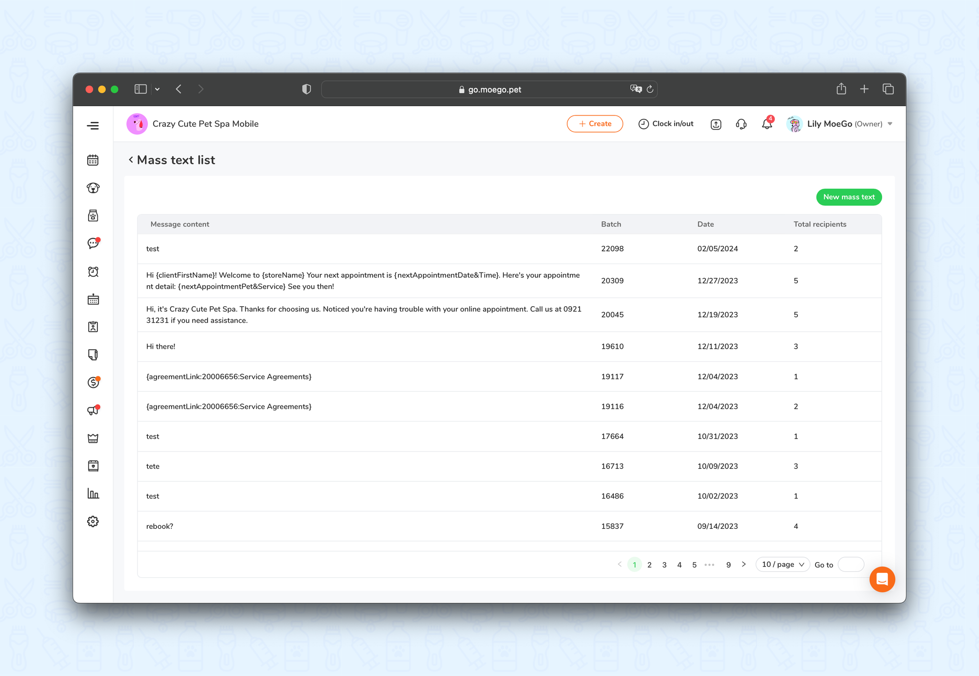 Send a mass text to a specific group of your customers! You can use it to announce price changes, activate nonrecurring customers, send to customers who haven't signed a digital agreement, or whose vaccination is expired, etc.