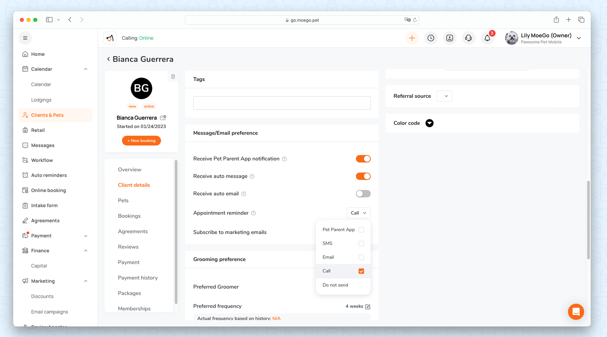 - Reminders: Sending appointment reminders, auto rebook reminders, or pet birthday reminders.