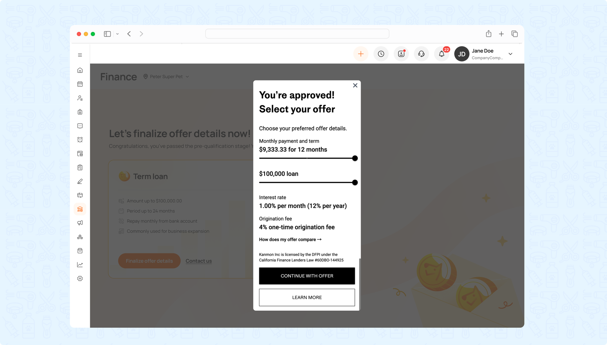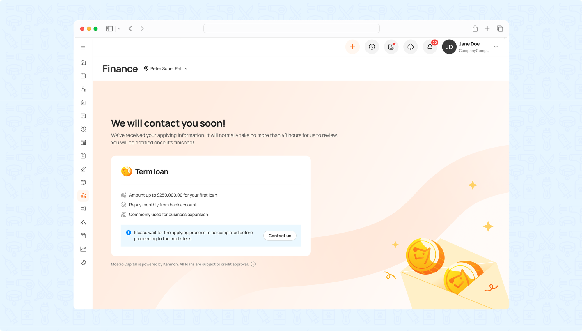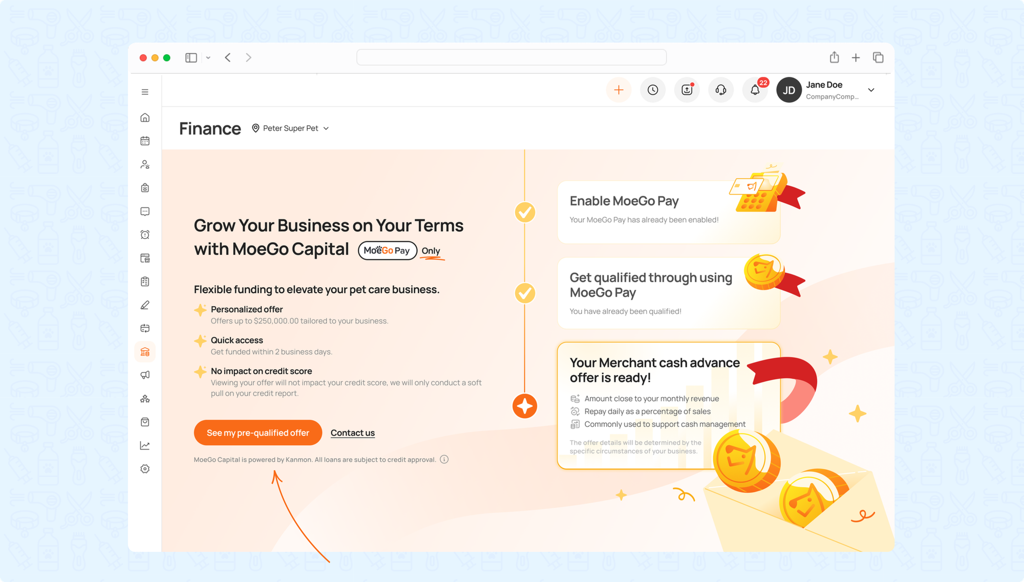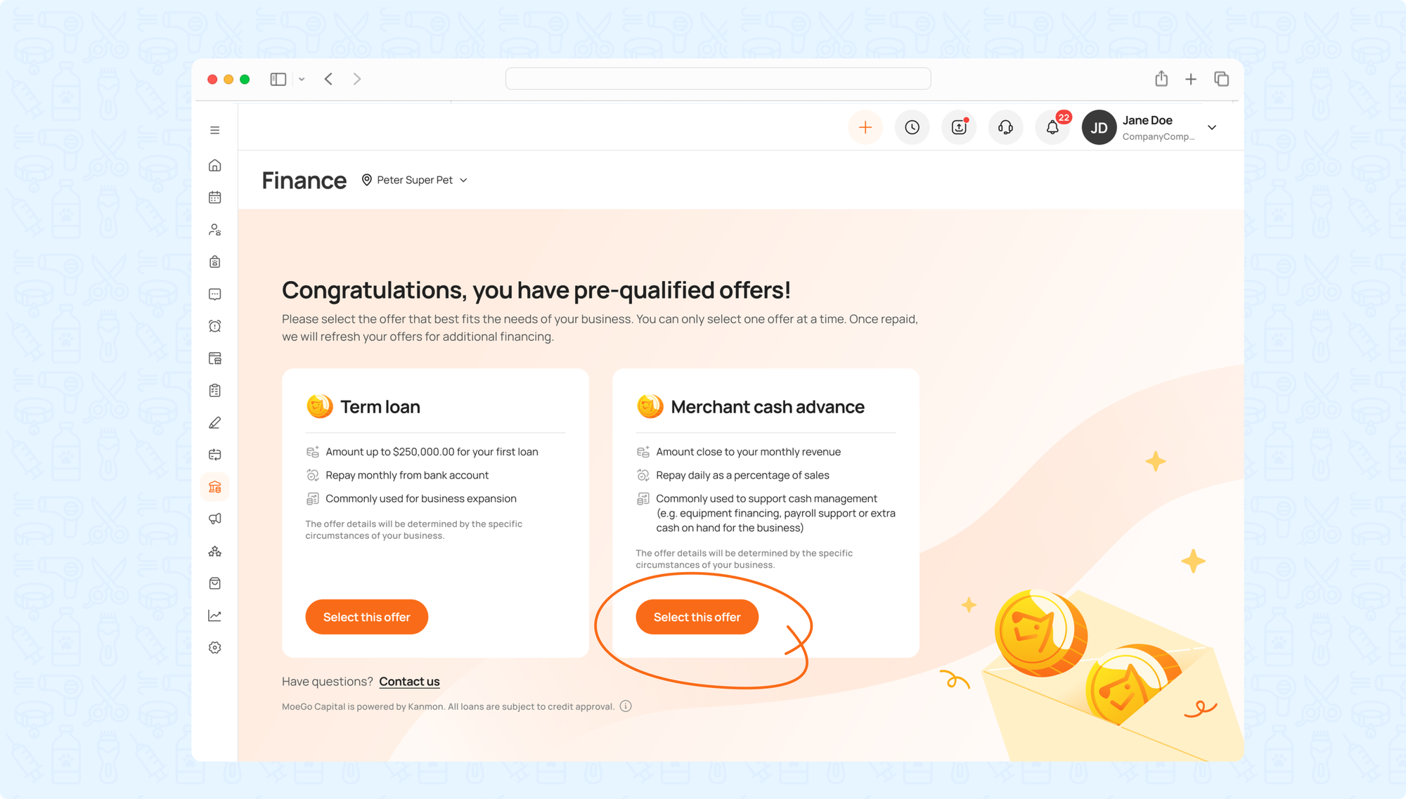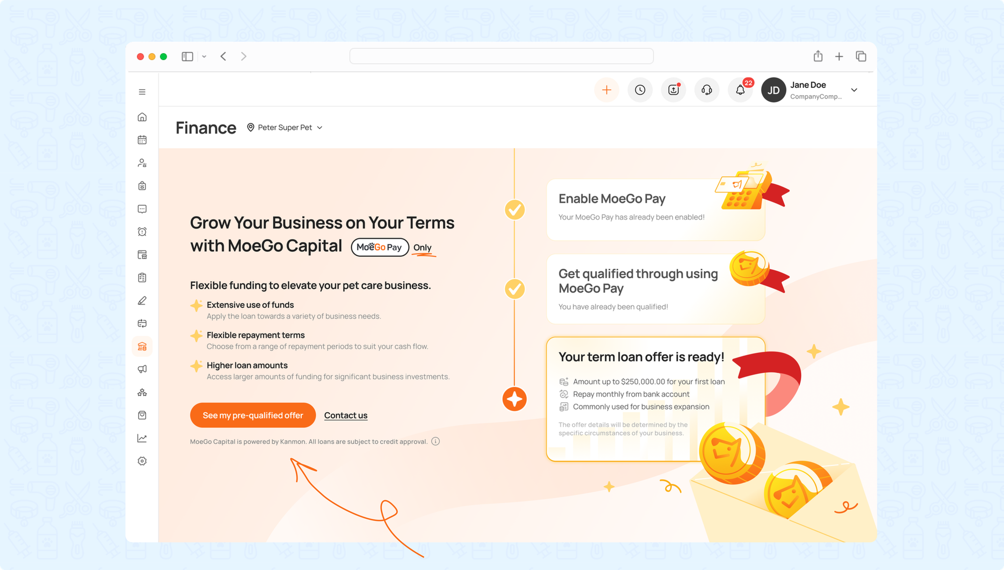 MoeGo Capital is powered by Kanmon, which is integrated directly into the MoeGo finance dashboard, ensuring a seamless and hassle-free experience. On the same page, with one click to: