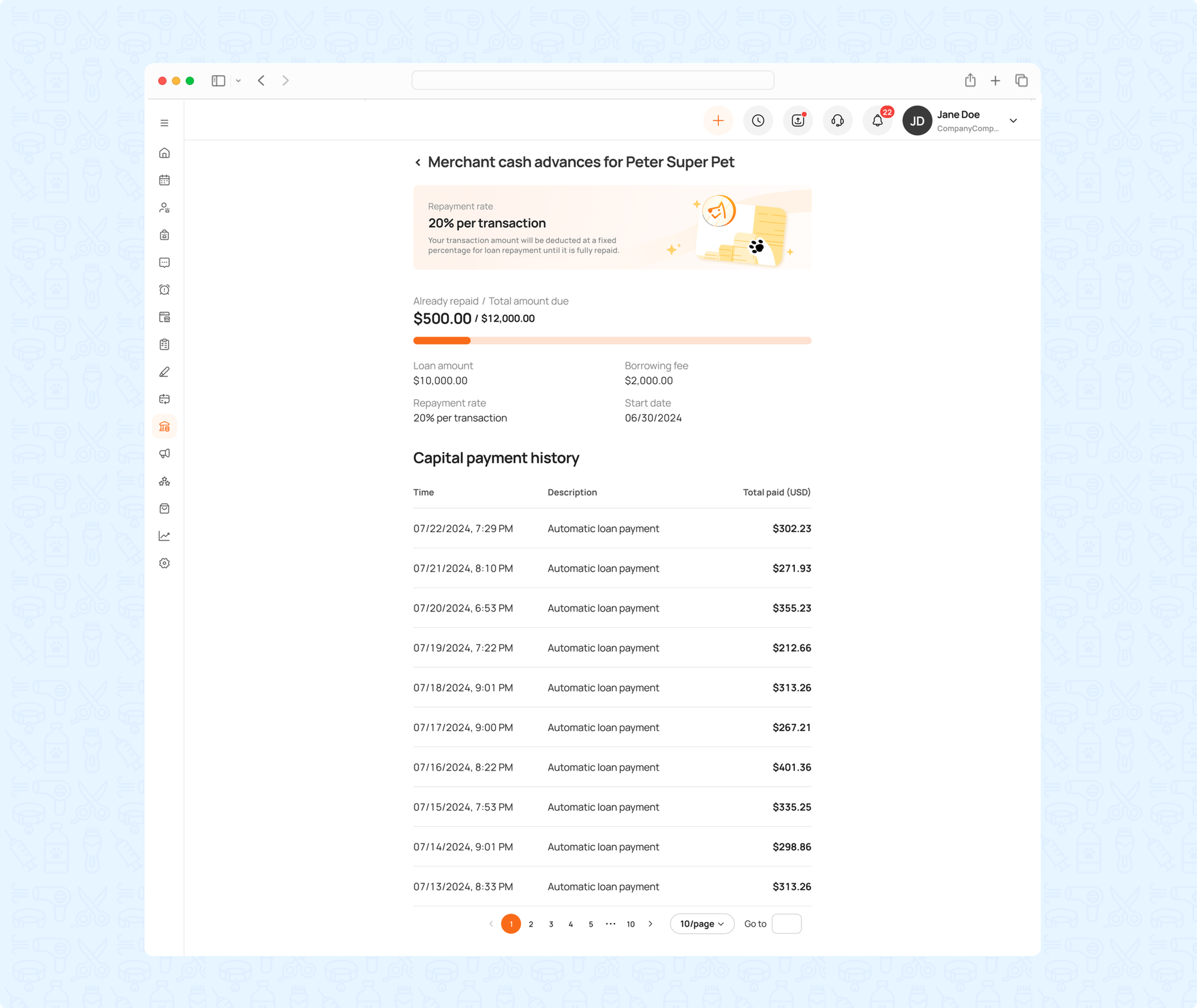 - Repayment rate: The percentage of each transaction that will be deducted automatically to pay back the loan