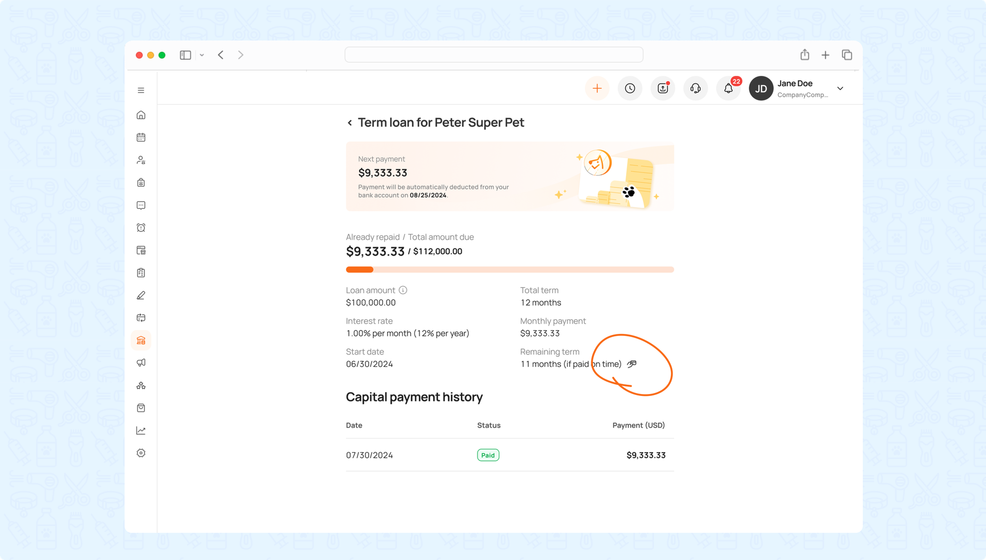 - Remaining term: the amount of months left until the loan is fully repaid.