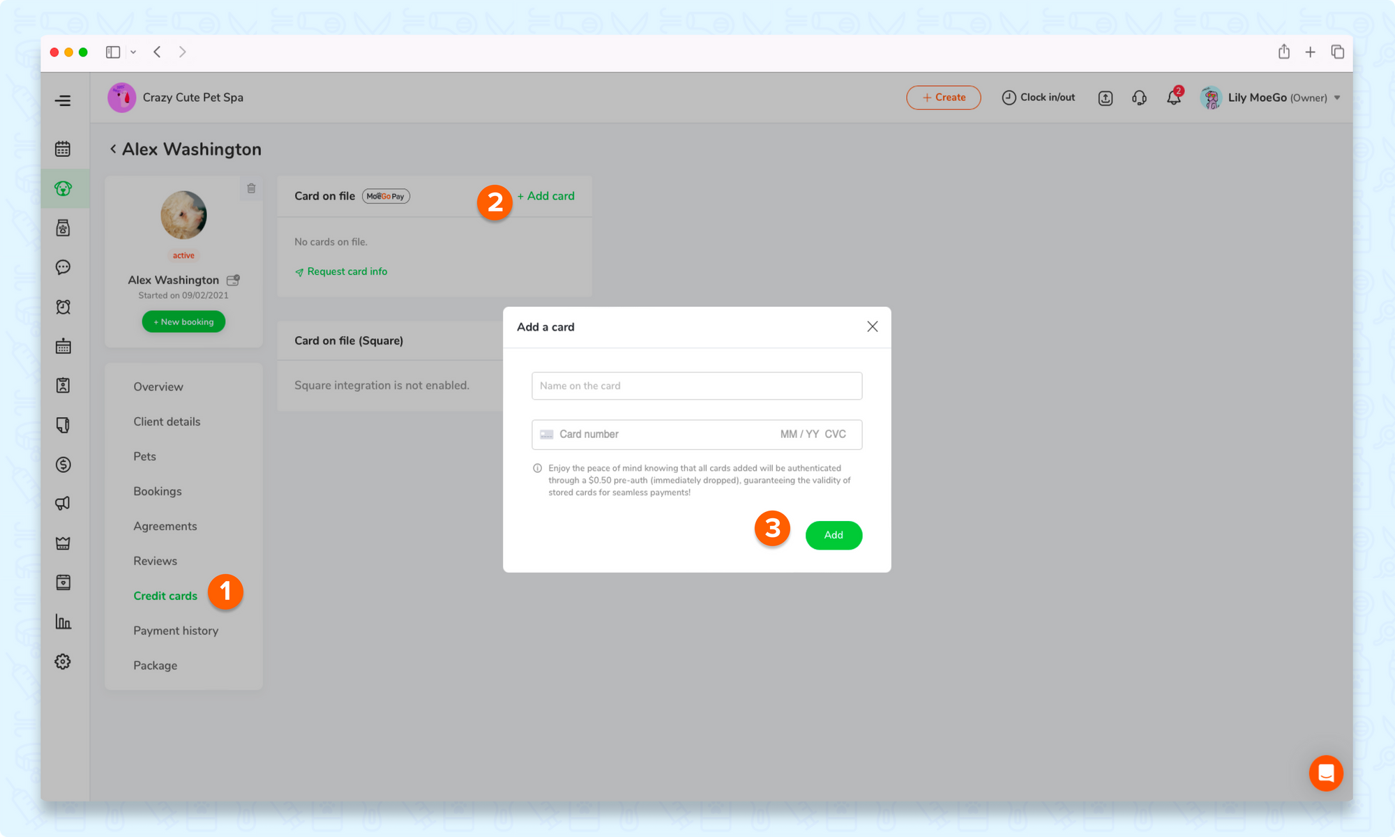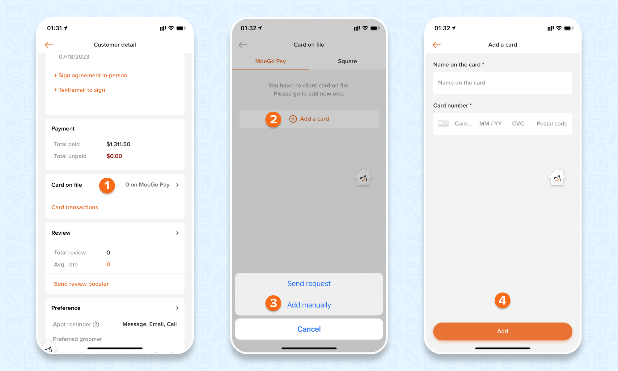 MoeGo Pay makes it easy for you to add a customer's Card on File with a few clicks! The saved card information can be utilized for future transactions, while eliminating the need for customers to repeatedly input their payment details.
