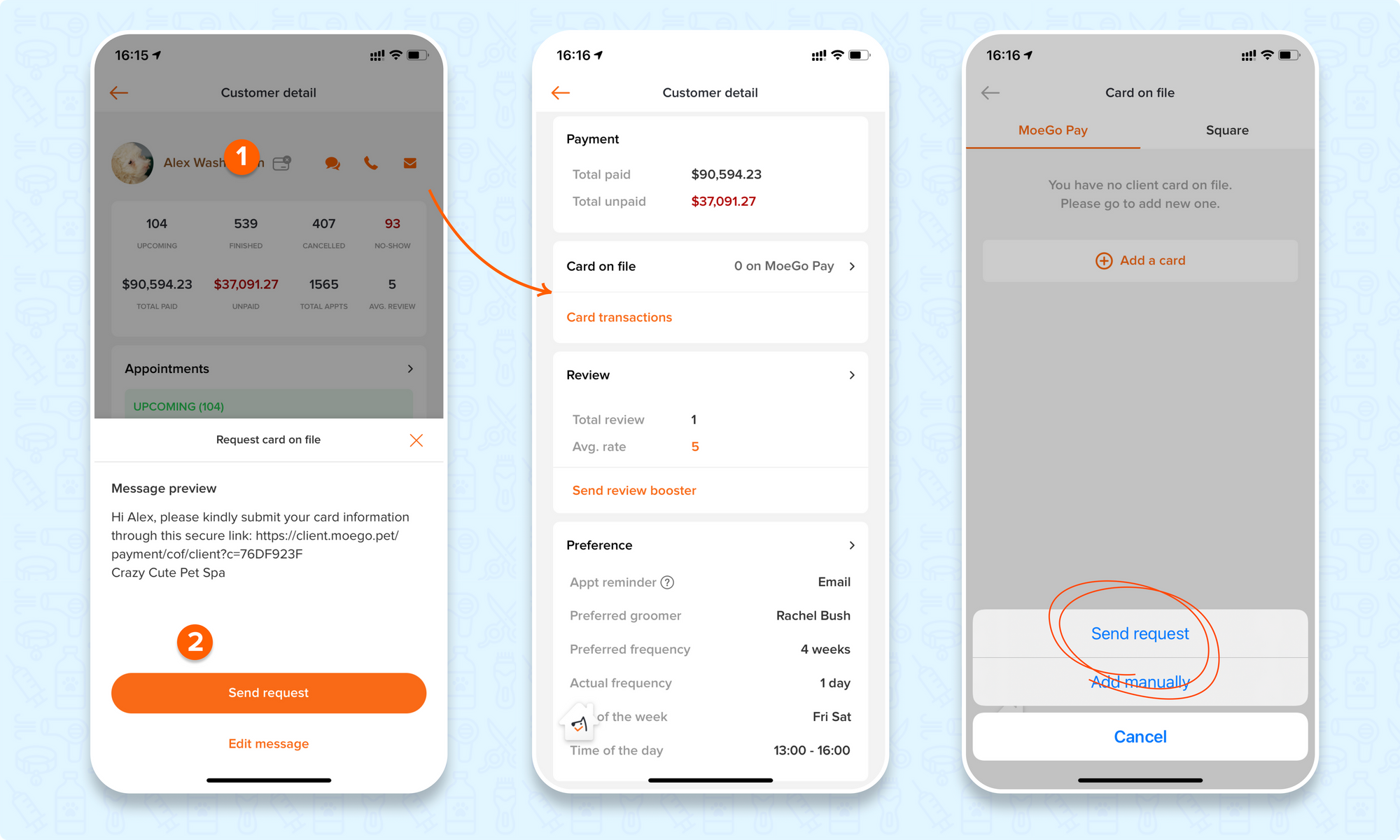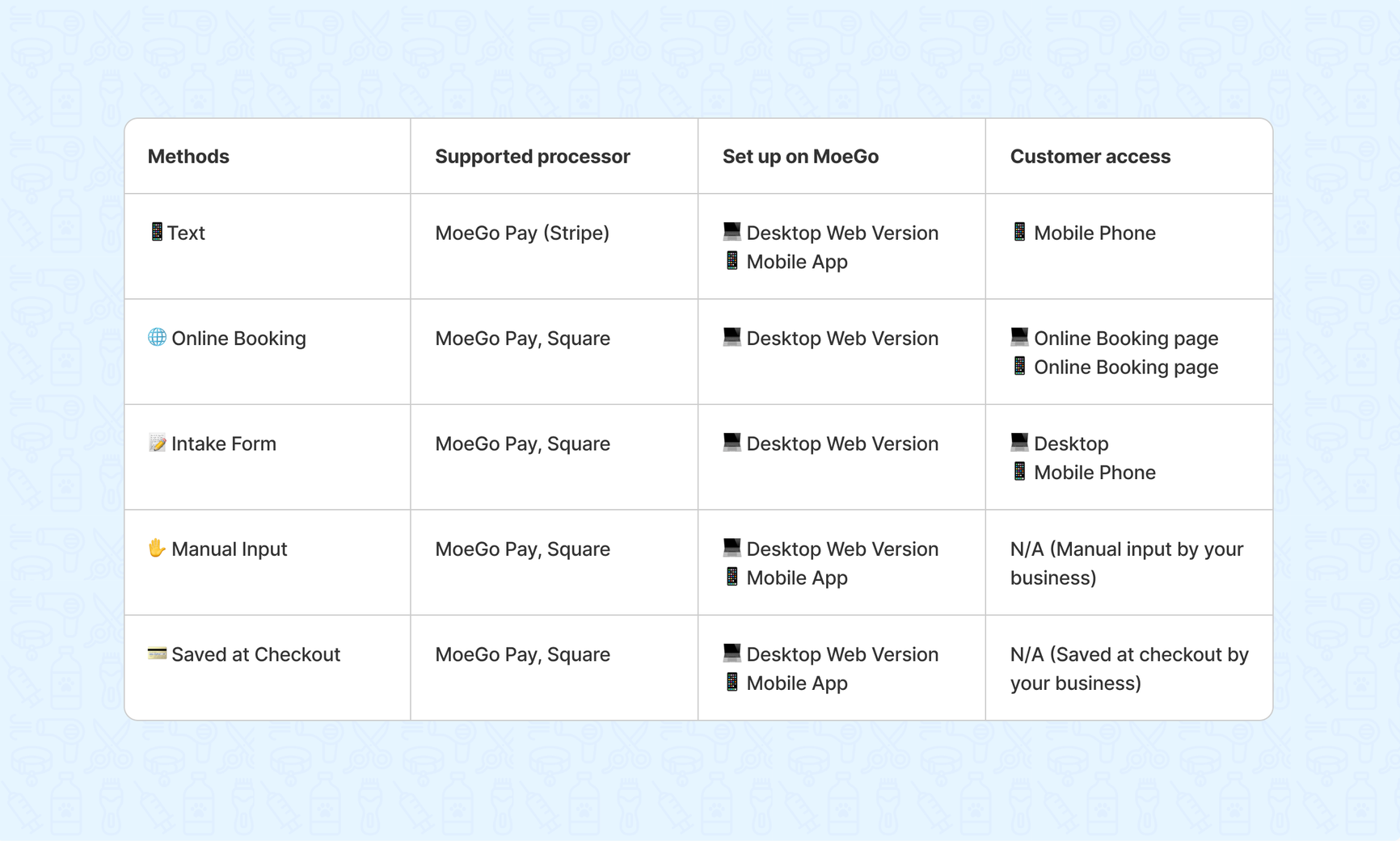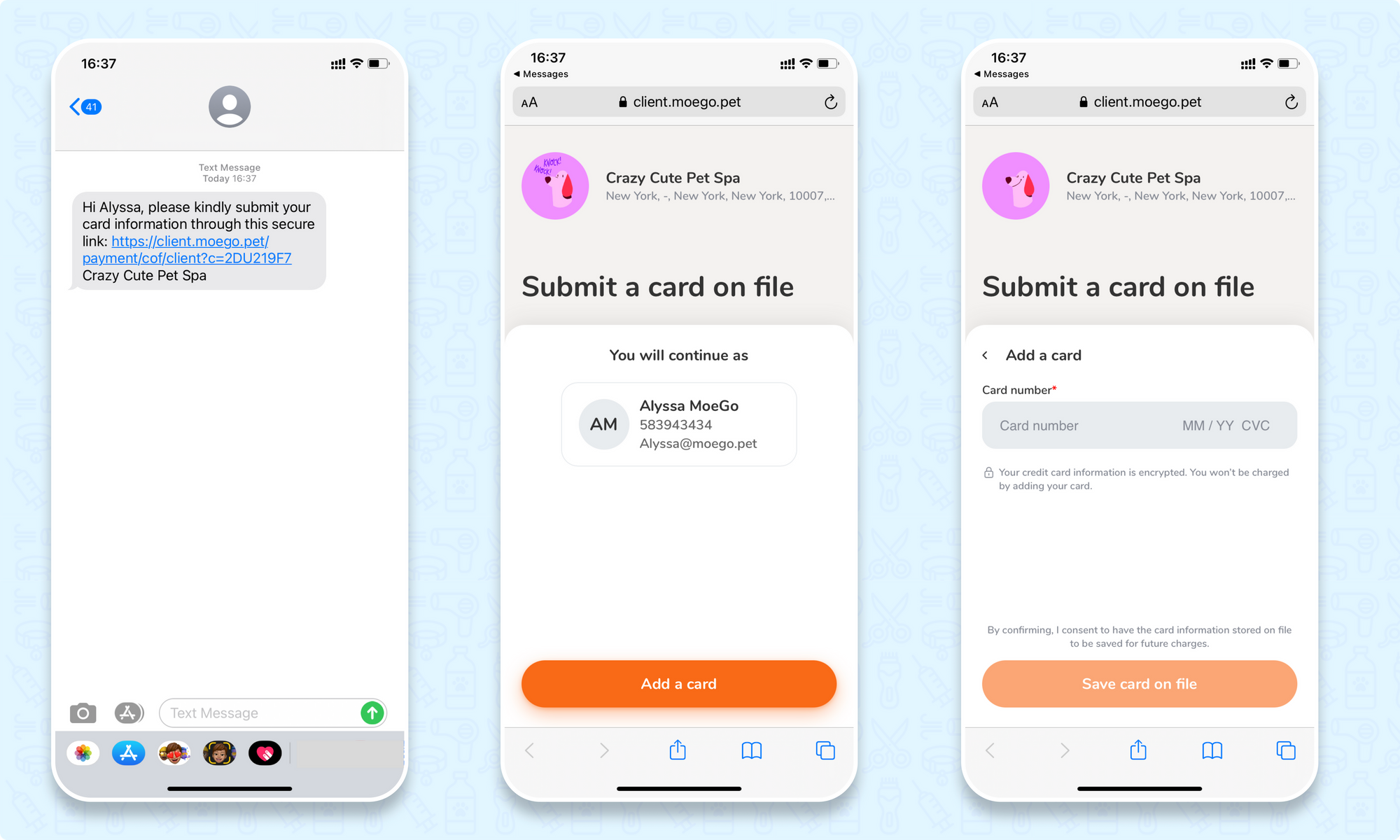 Recognizing that you may have varying preferences and needs, MoeGo offers 5 convenient ways through which you can set up the Card on File request or requirement. For your customers, they may add their Card on File on their phones or computer by the unique link in your Text, in Online Booking, or through the Intake Form.