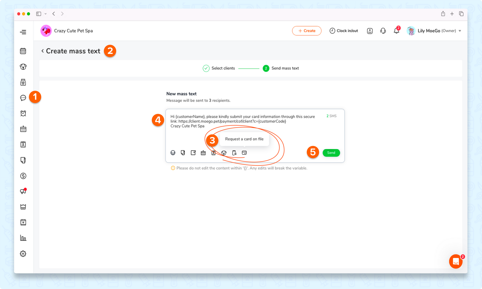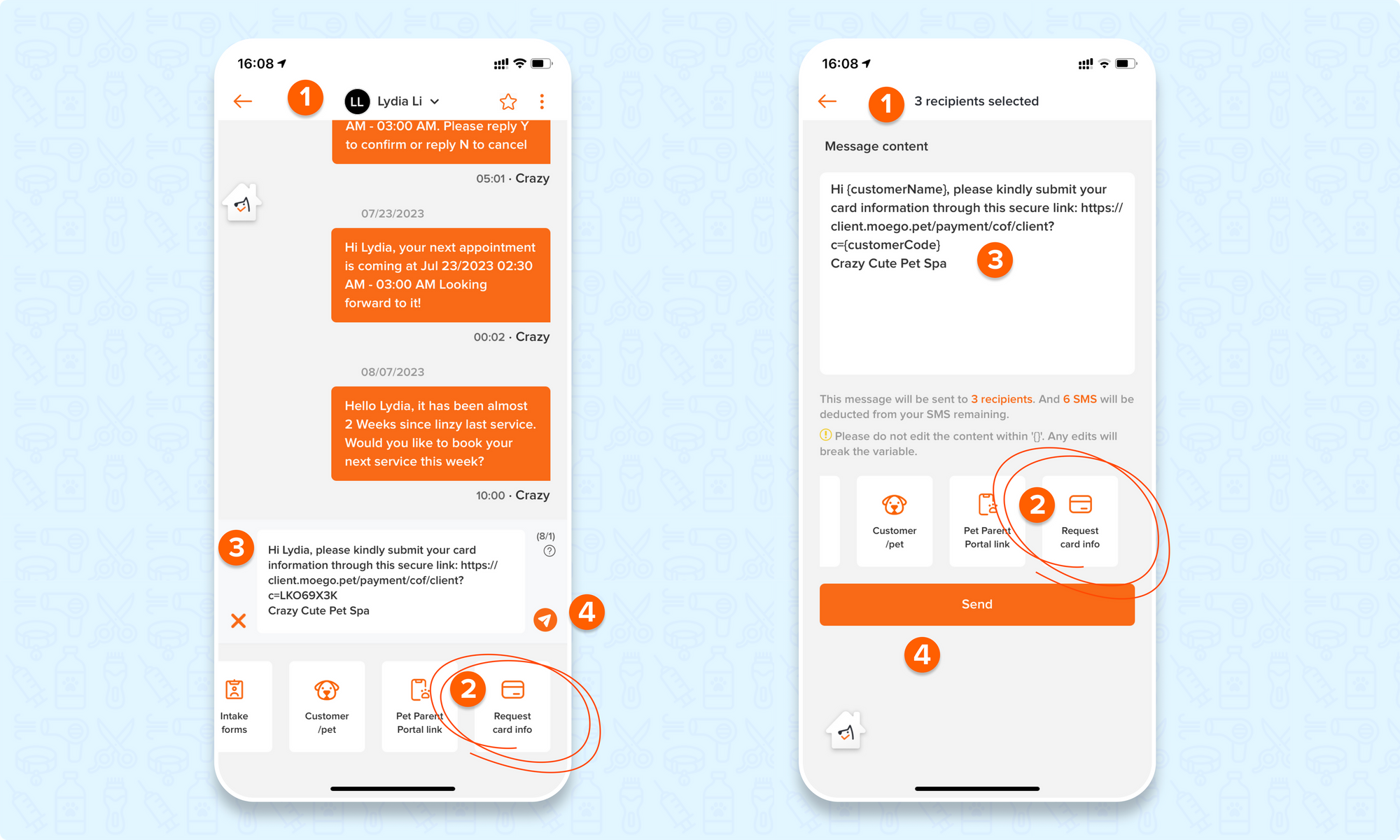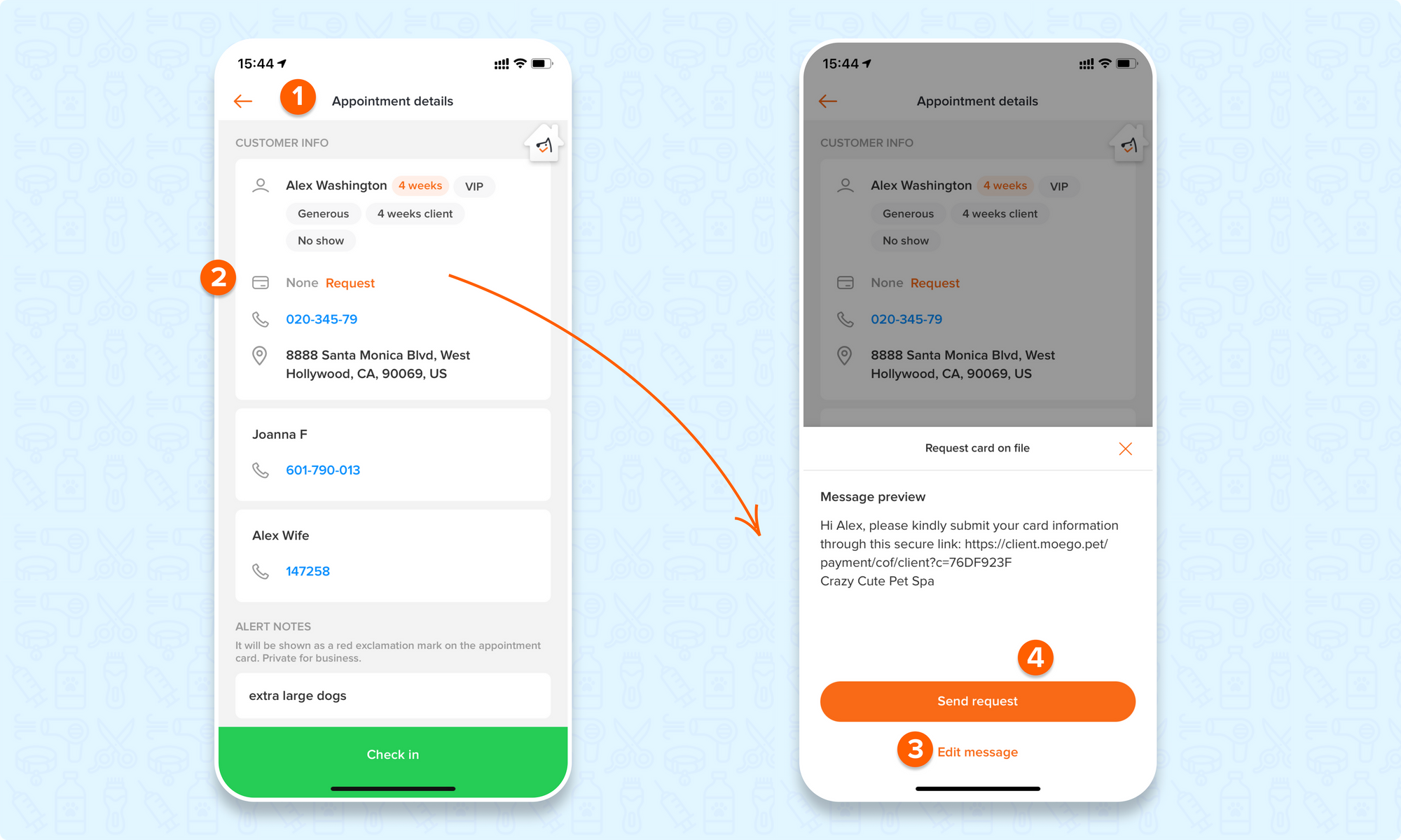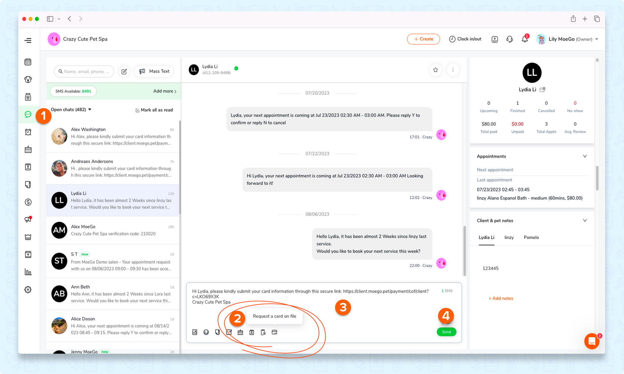 Recognizing that you may have varying preferences and needs, MoeGo offers 5 convenient ways through which you can set up the Card on File request or requirement. For your customers, they may add their Card on File on their phones or computer by the unique link in your Text, in Online Booking, or through the Intake Form.