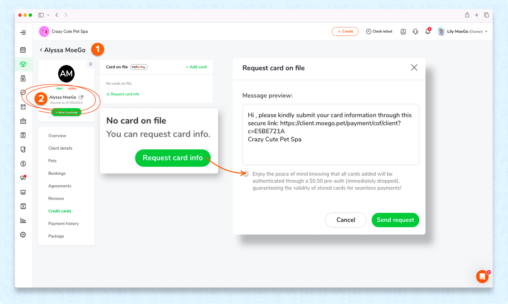 - Hover over the greyed-out credit card icon and select < Request card info > and then select < Send request >