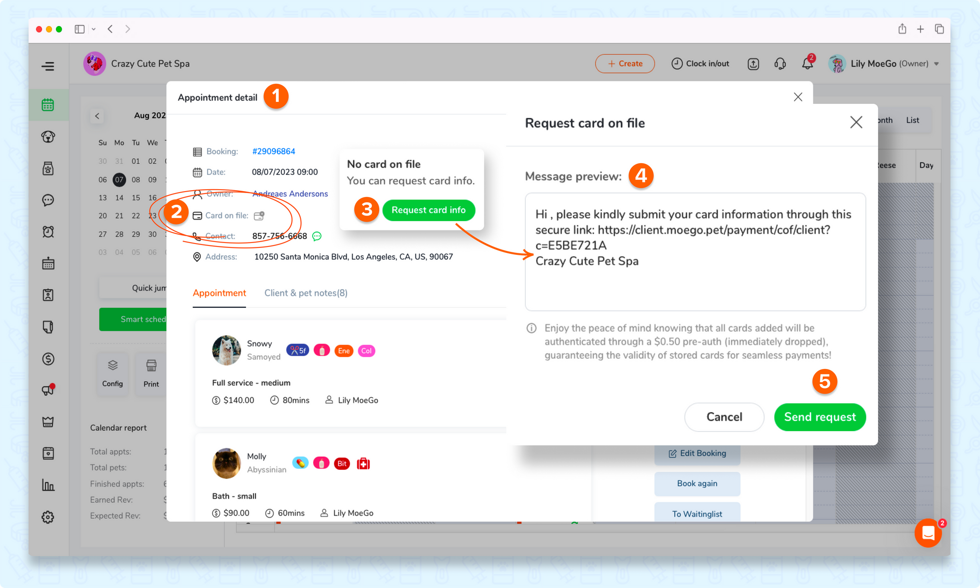 At the final step of online booking, the client will need to look through the no-show policy and add the card info to submit the request. Once the booking request is successfully submitted, the credit card payment information can be stored.