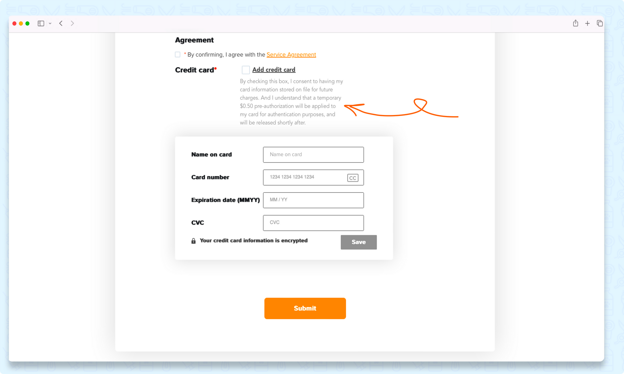 Simplify data collection by offering the option to save card information right from your intake forms.